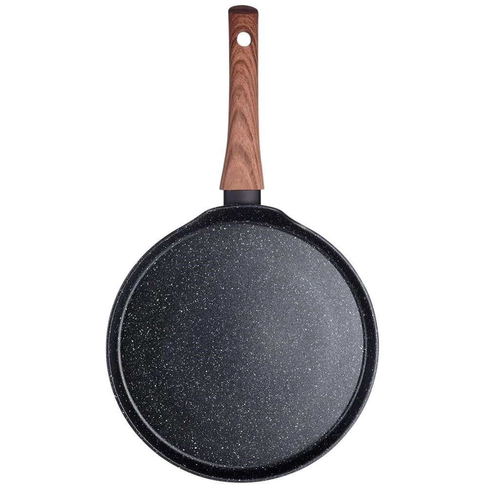 - PRZYDATNA - Płaska patelnia z powłoką granitową o średnicy 26 cm. Doskonała do smażenia naleśników oraz placków. Wymiary zewnętrzne: długość 46 cm, wysokość patelni 1,5 cm, wysokość z rączką 6 cm. Patelnia z linii Black&Wood.