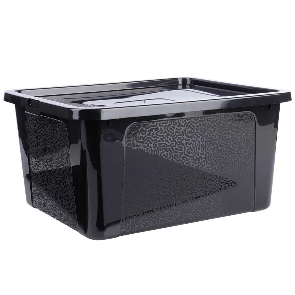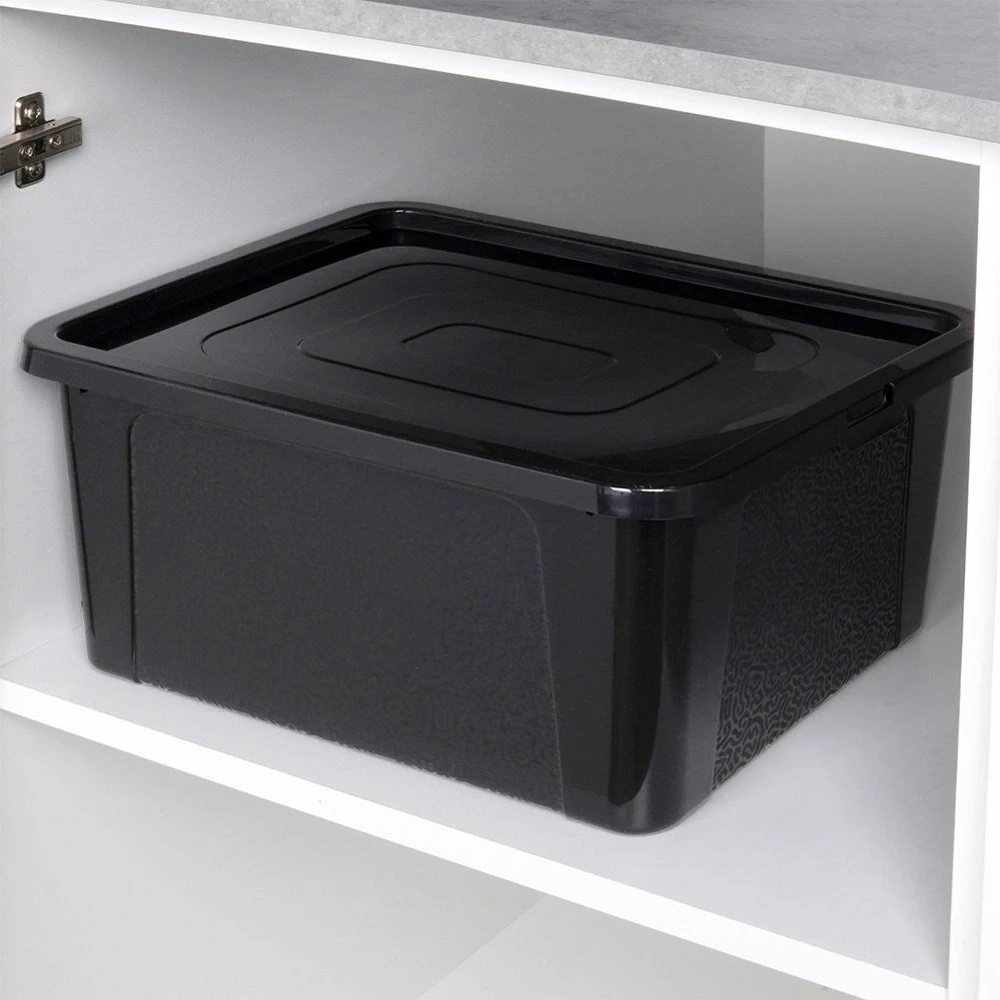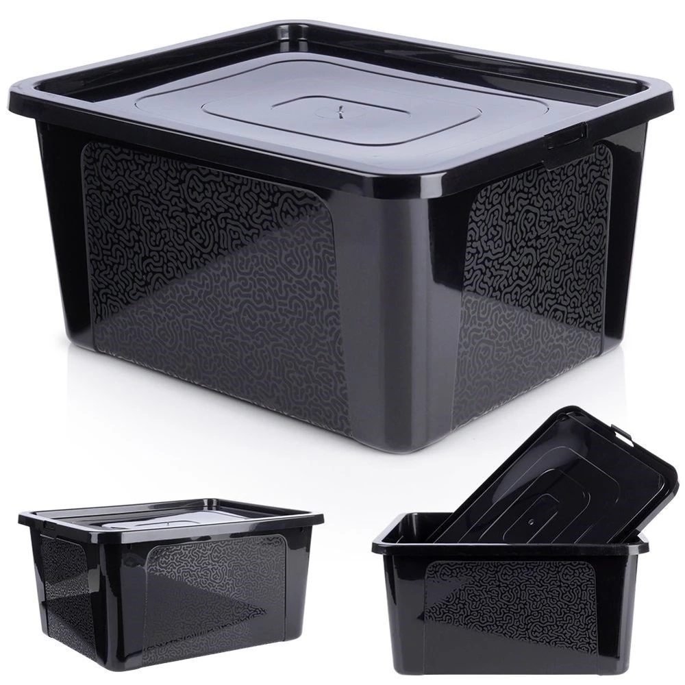 - Pojemnik z pokrywą, przeznaczony do przechowywania różnych przedmiotów. Pomoże w utrzymaniu porządku. Wykonany z wytrzymałego tworzywa w czarnym kolorze.