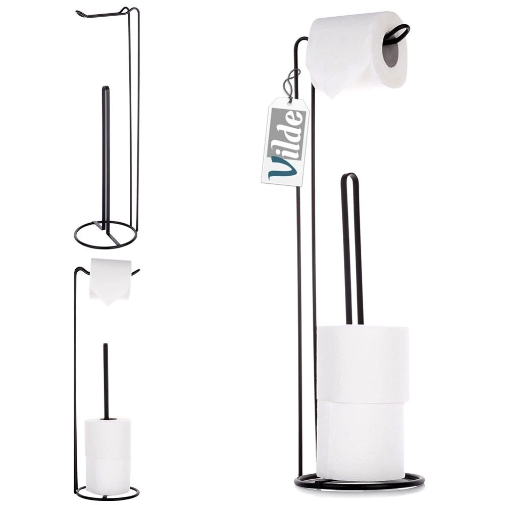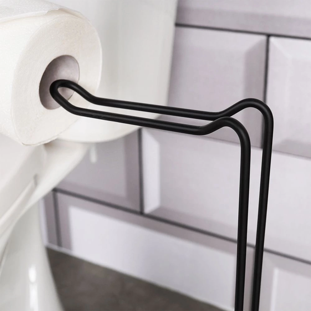 - Stojak łazienkowy na papier toaletowy z uchwytem. Wykonany z metalu w czarnym, matowym kolorze. Pomieści 4 rolki papieru toaletowego. Zajmuje mało miejsca.