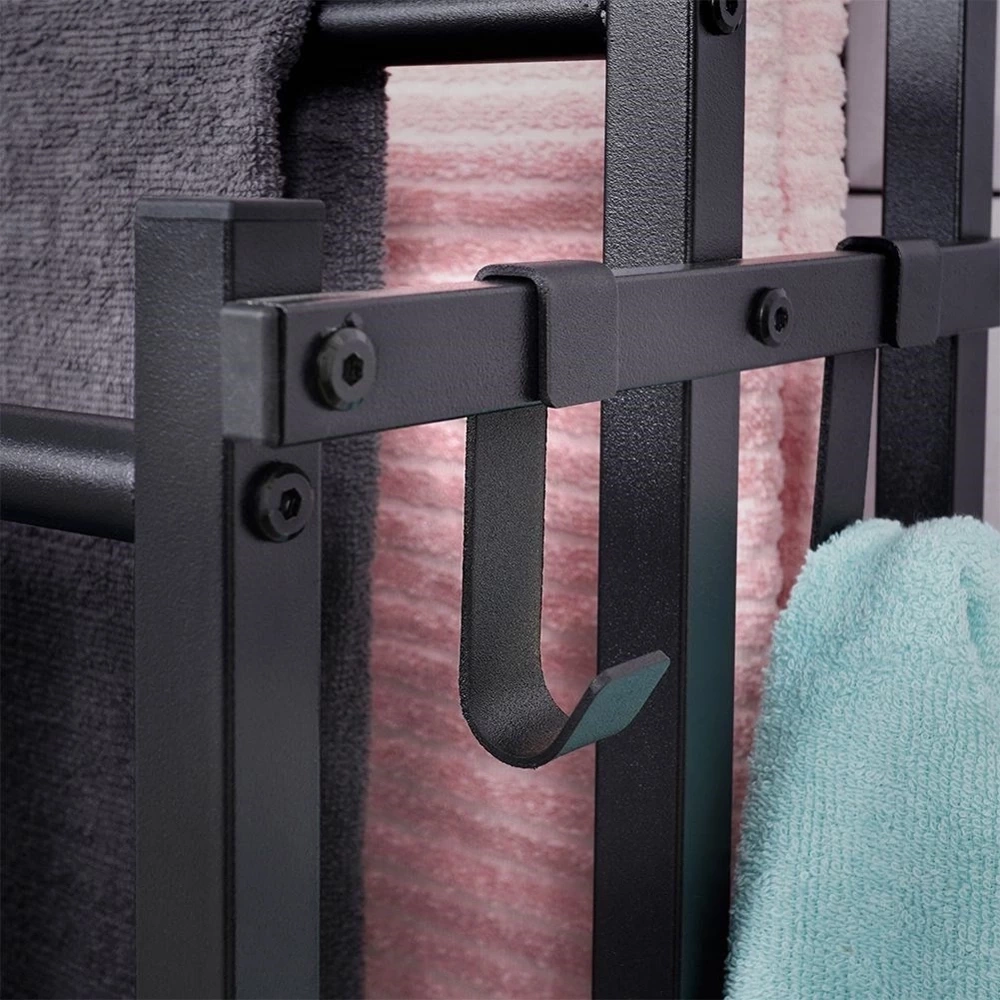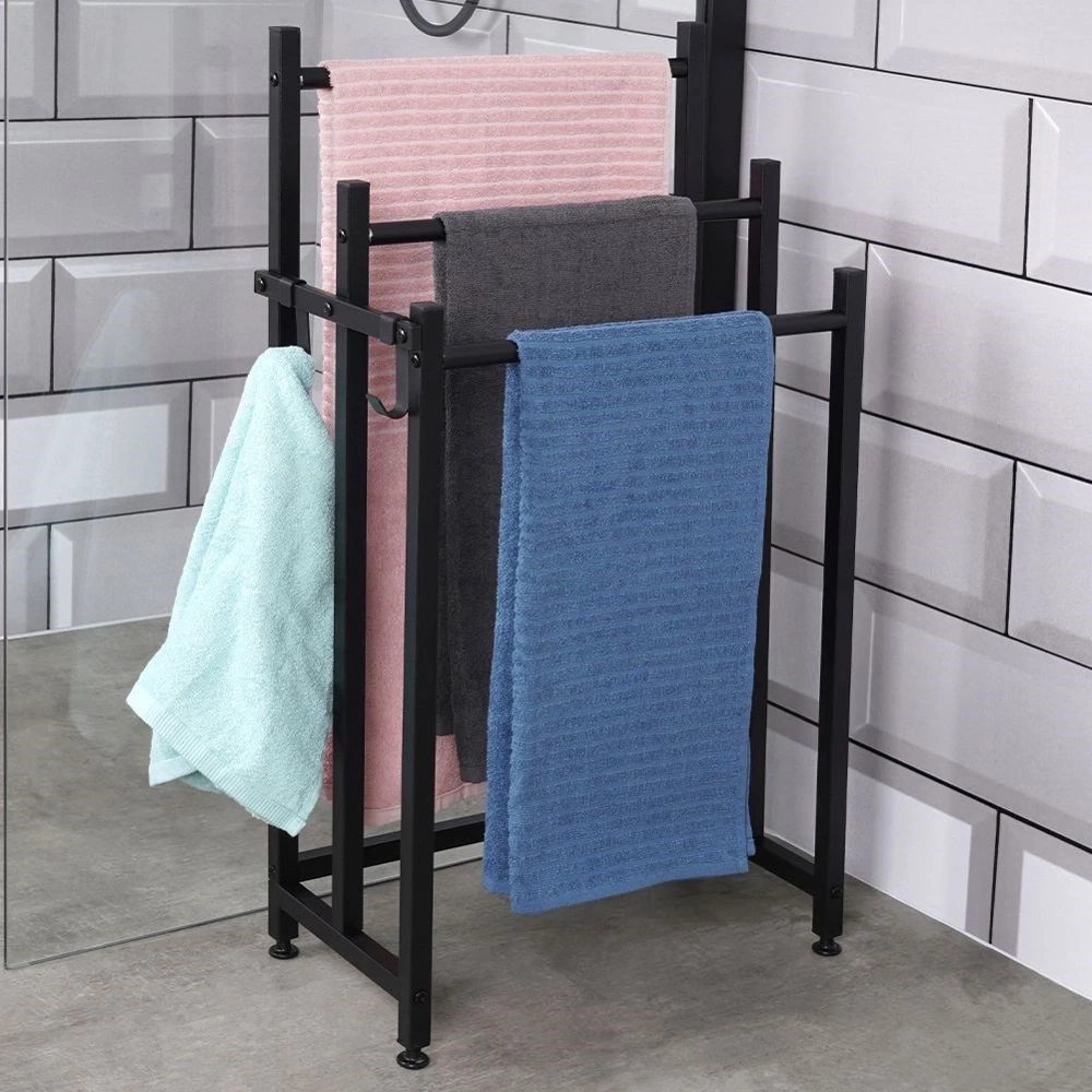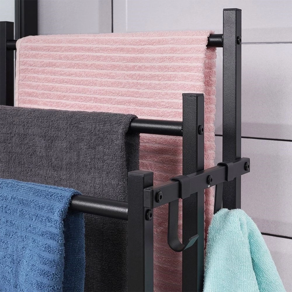 - Praktyczny, wolnostojący wieszak na ręczniki lub ubrania. Posiada 3 poprzeczki oraz 2 haczyki do zawieszenia ręczników. Utrzymany w modnym, czarnym kolorze.