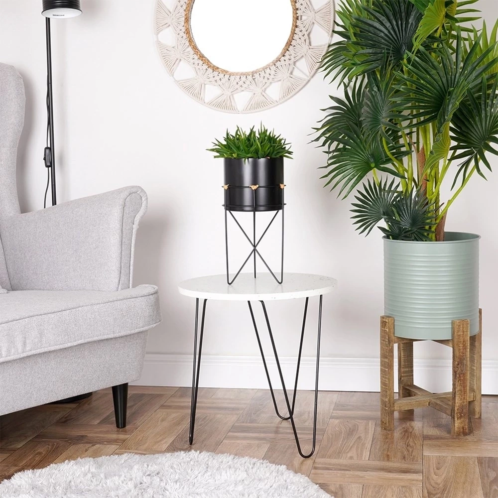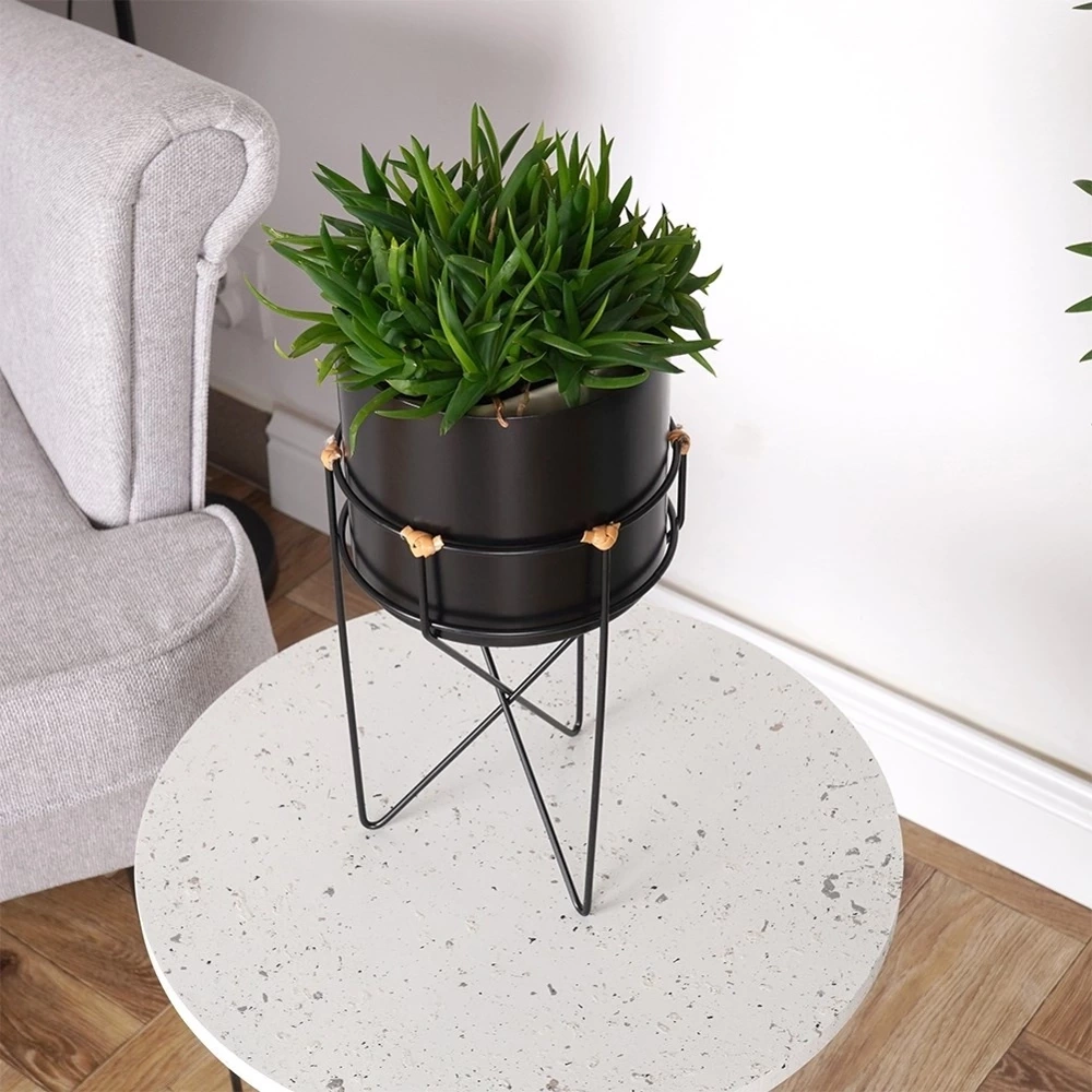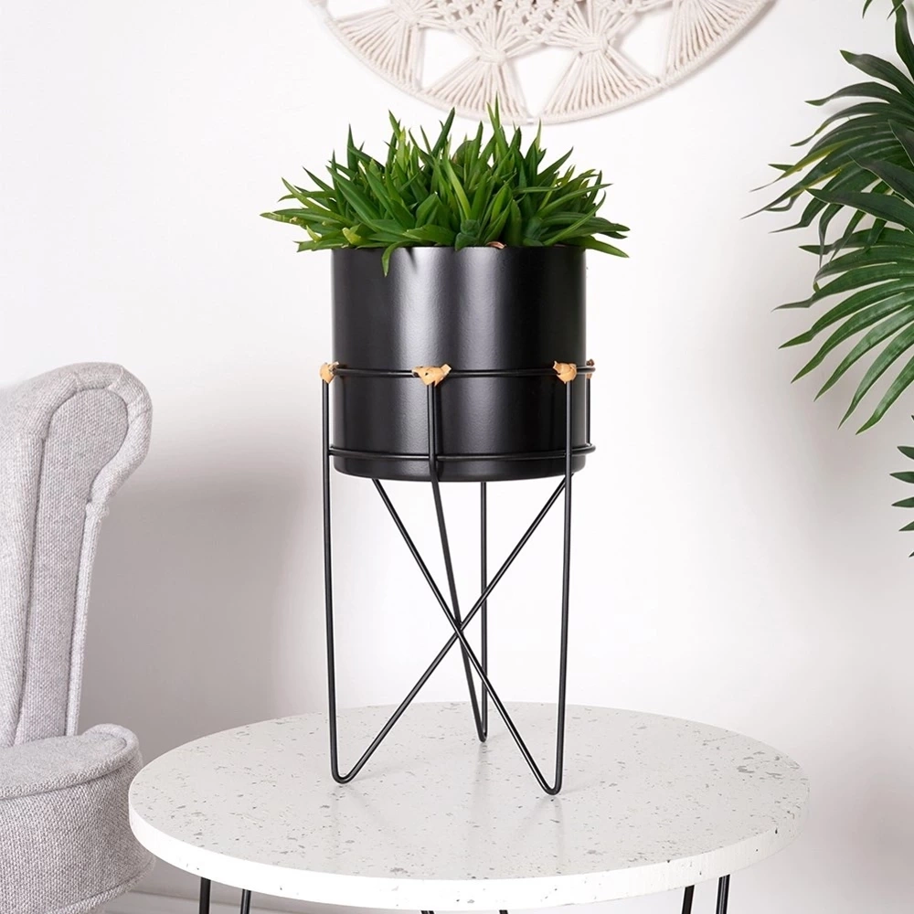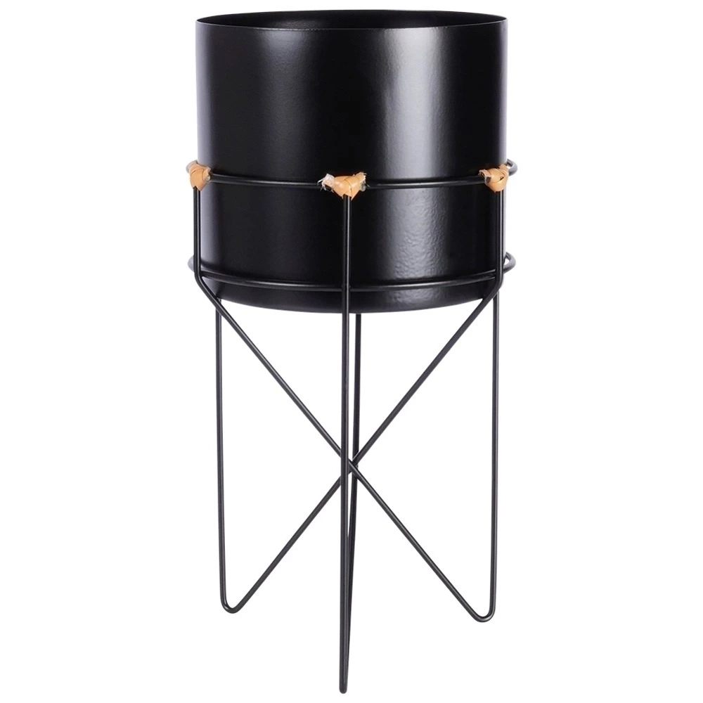 - Czarna, metalowa osłonka na doniczkę usadowiona na stojaku w kolorze czarnym. Dzięki niej efektownie wyeksponujemy ulubione rośliny żywe lub sztuczne.