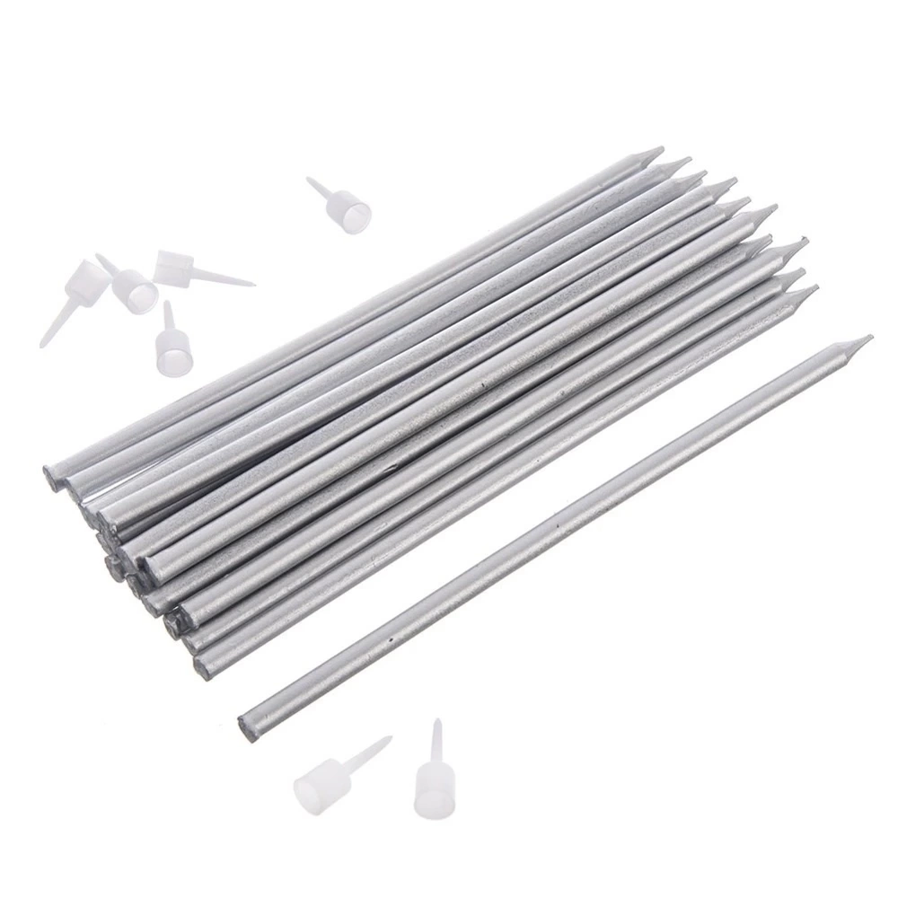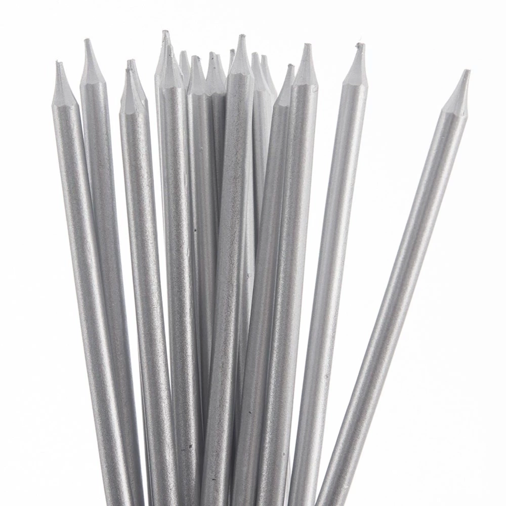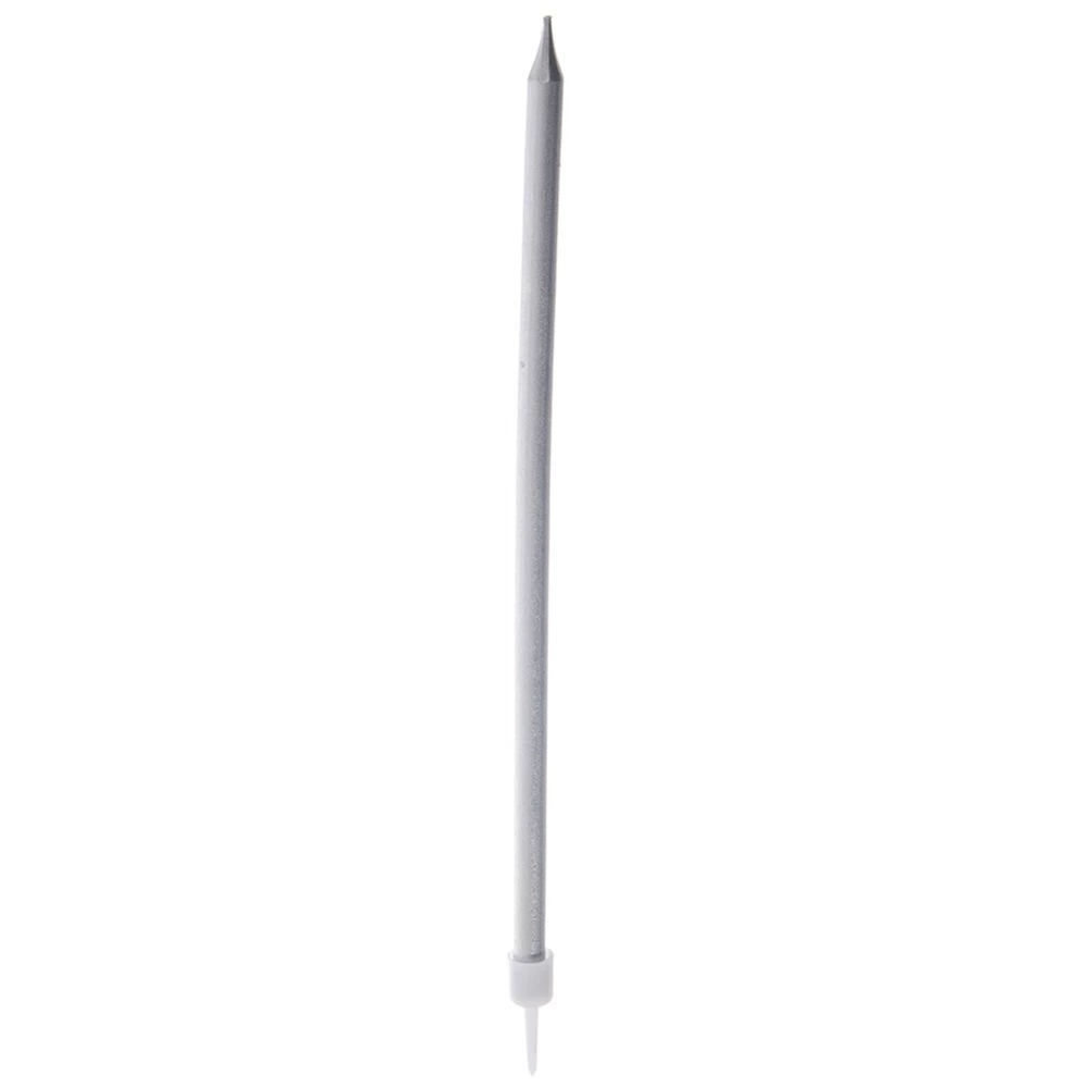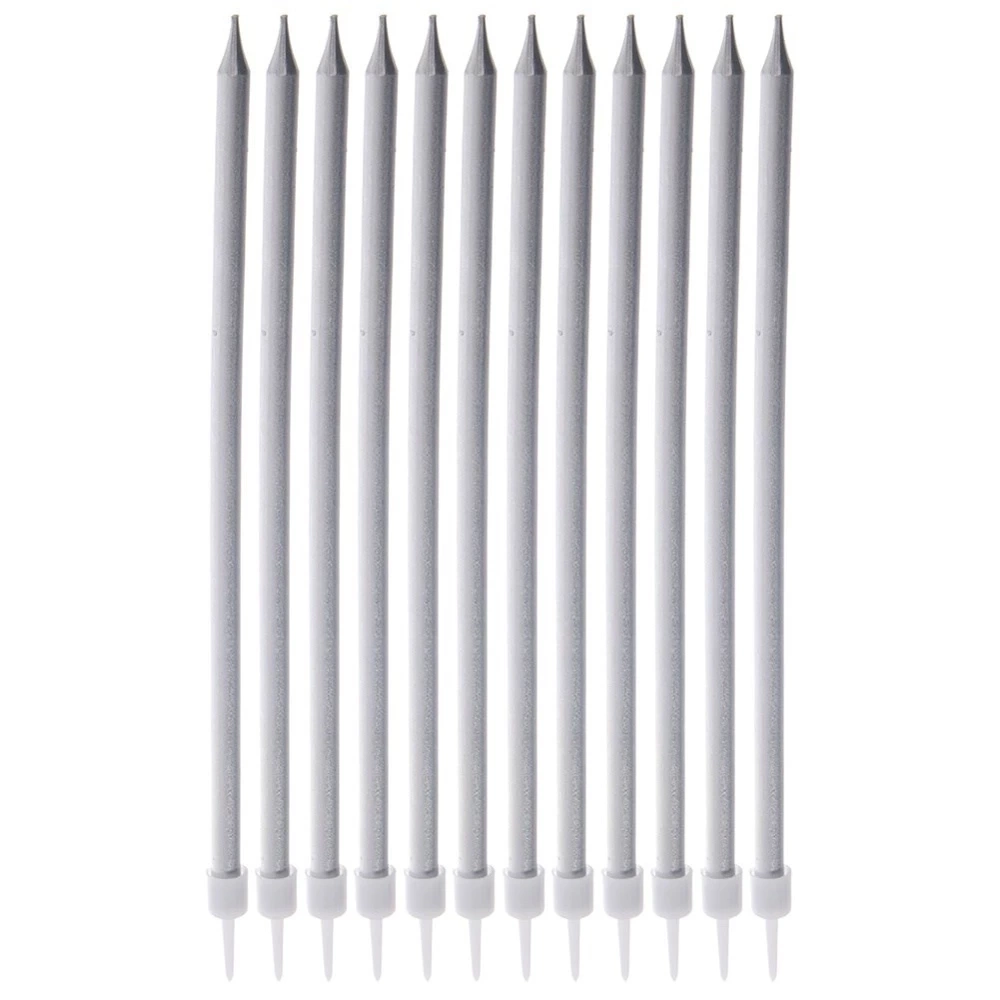 - Zestaw 12 długich świeczek do tortu wraz z podstawkami, które zapewnią im stabilność. Świeczki mają długość 14,5 cm i są w kolorze srebrnym.