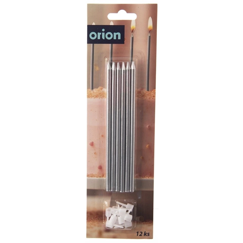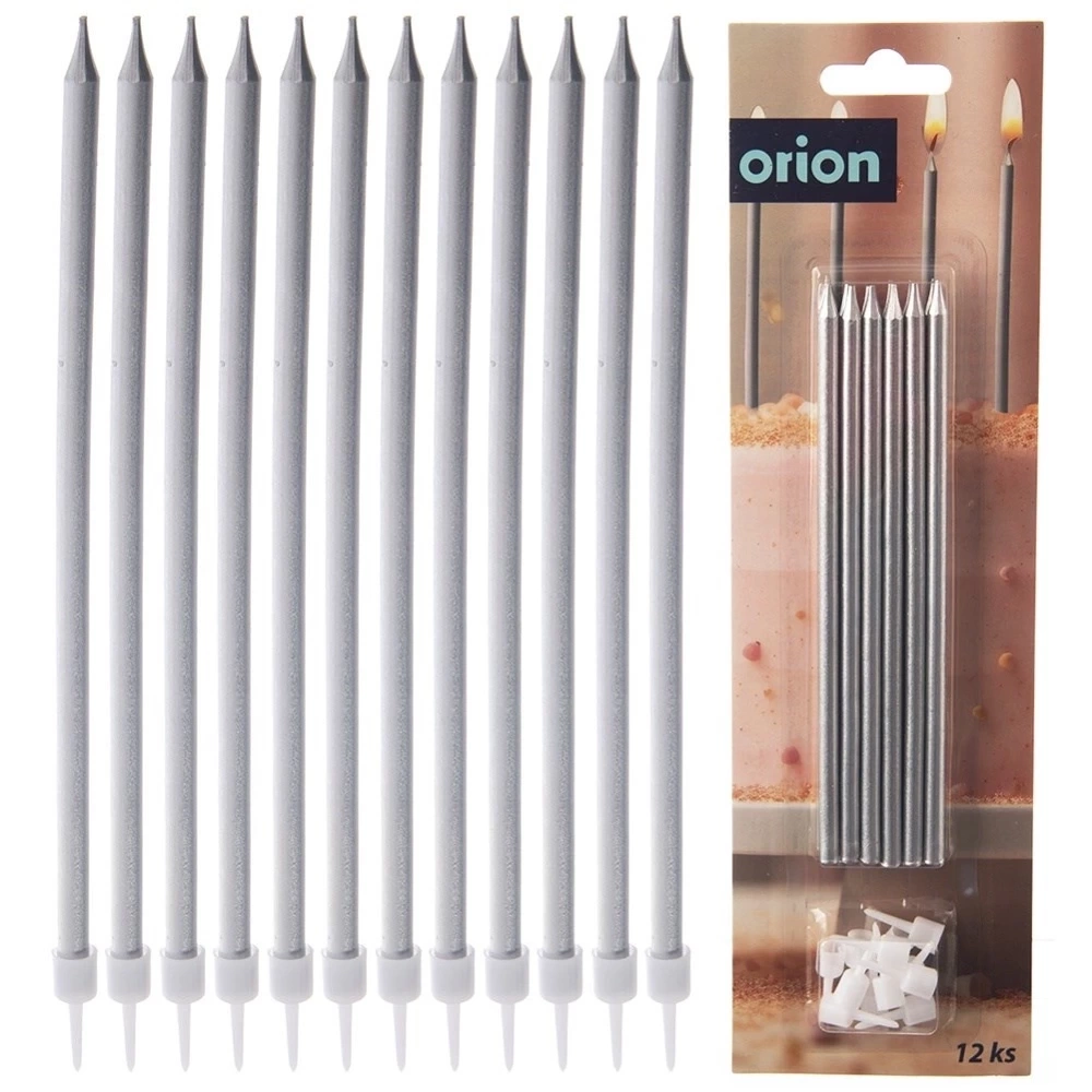 Zestaw 12 długich świeczek do tortu. Srebrne świeczki są uniwersalne, pasują do każdego rodzaju tortu. Wyposażone w podstawki ułatwiające umieszczanie, są praktyczne w użyciu. Świeczki to nieodłączny element każdego przyjęcia urodzinowego. Oryginalny produkt czeskiej marki Orion. Wyprodukowano zgodnie z europejskimi standardami.