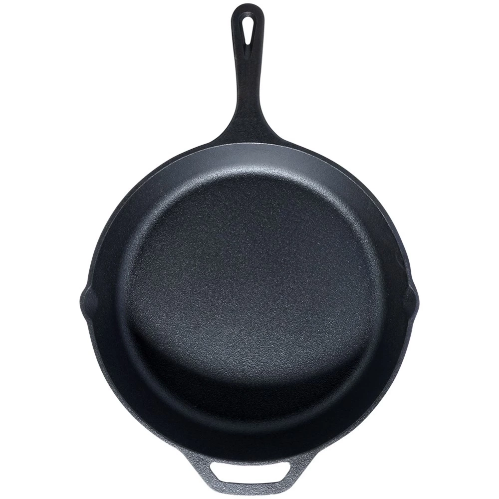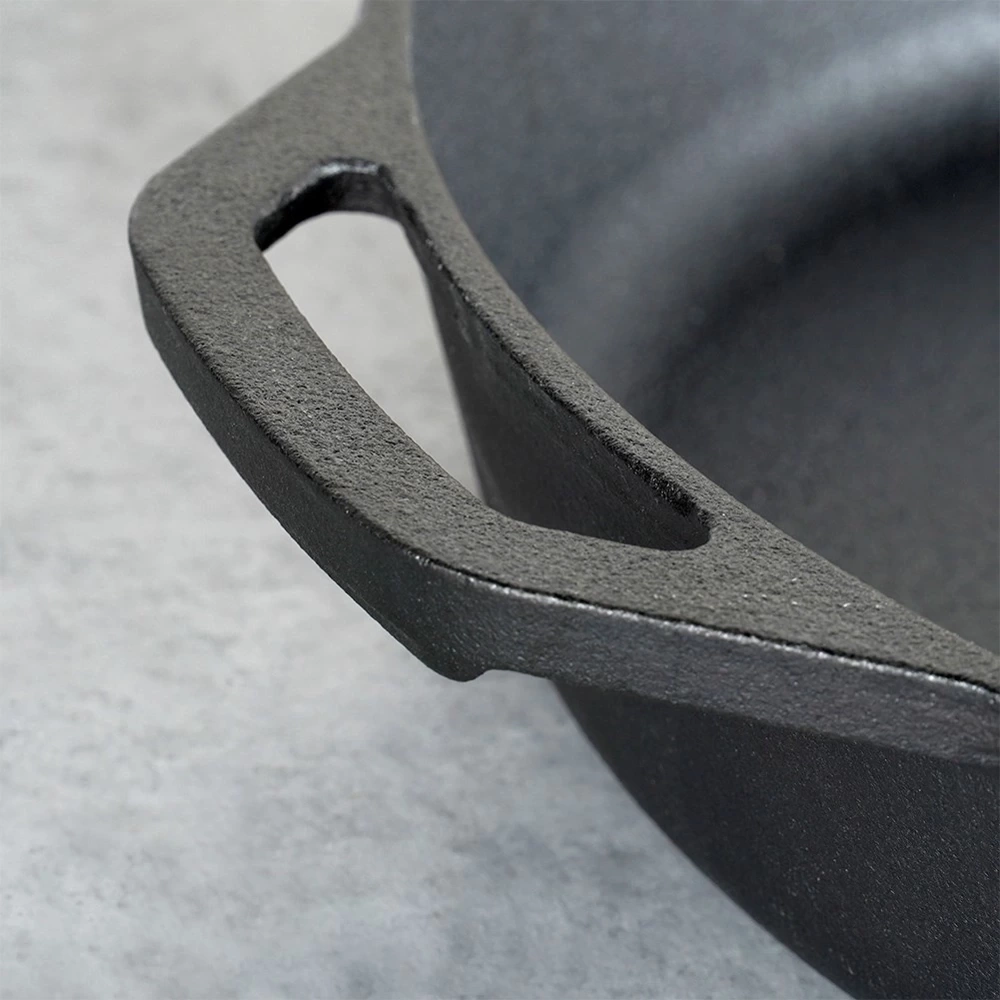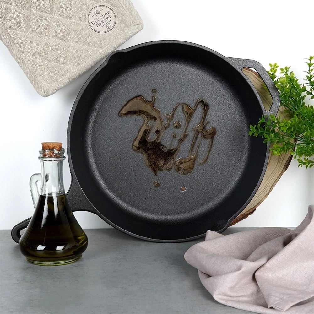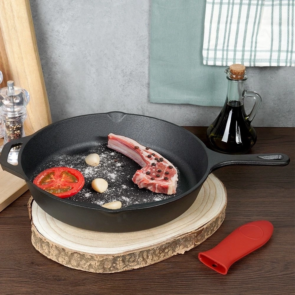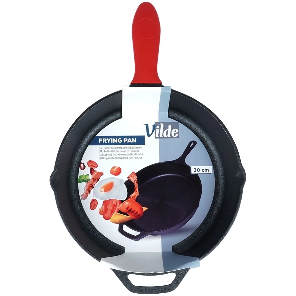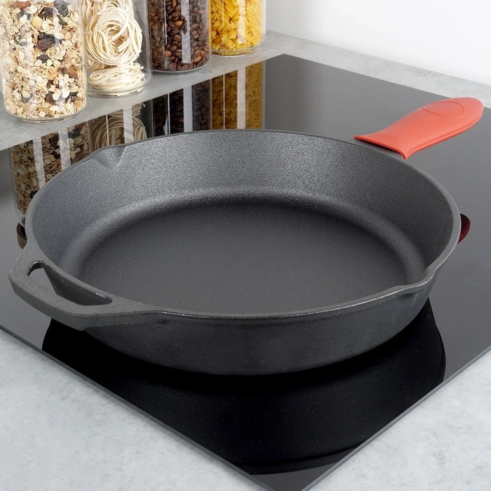 - Patelnia żeliwna o średnicy 30 cm w zestawie z ochronną nakładką silikonową na rączkę patelni. Można stosować ją na indukcji, w piekarnikach, na piecu i bezpośrednio na ogniu.