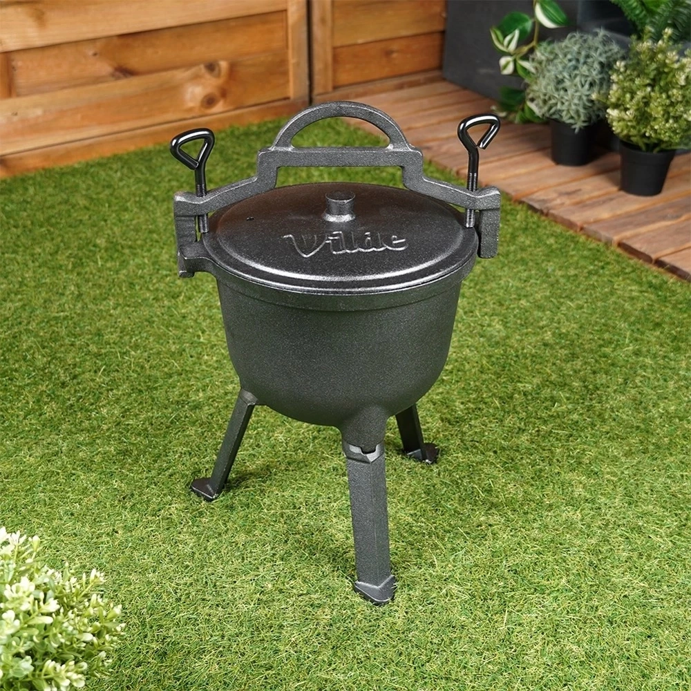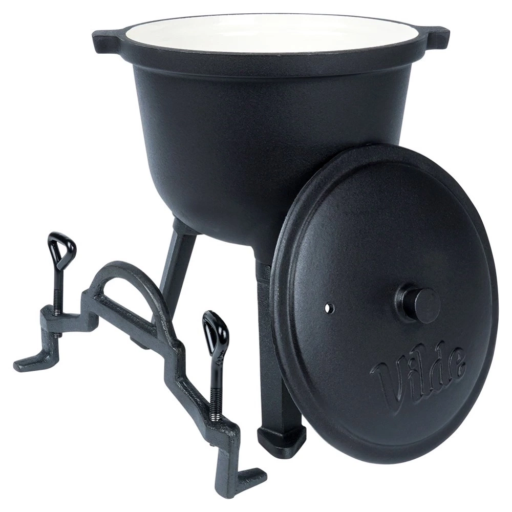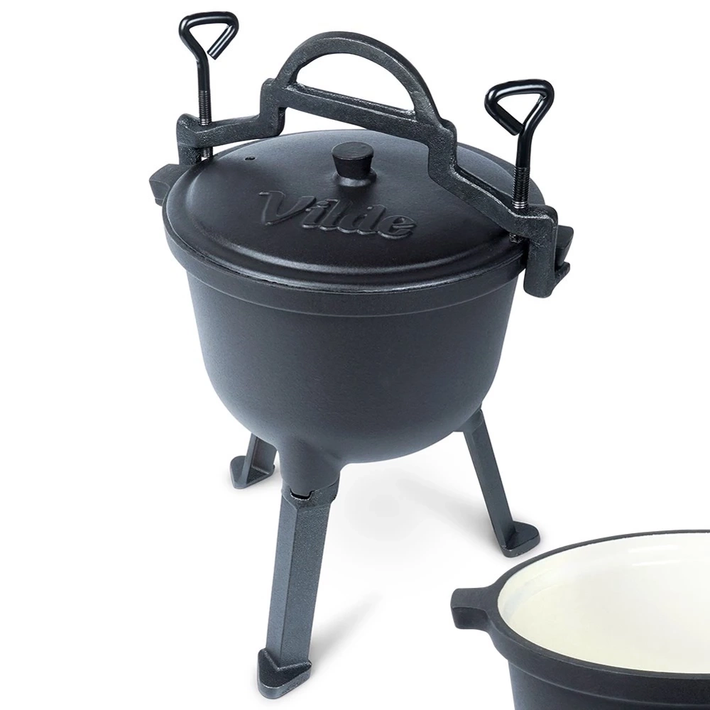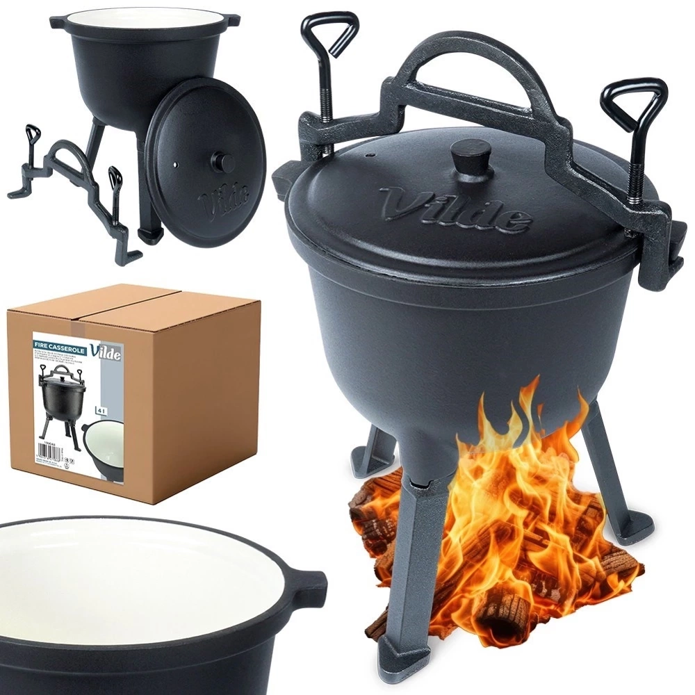 Okrągły kociołek żeliwny na nóżkach z pokrywką i uchwytem do zawieszenia, posiada emaliowany środek. Idealny do gotowania, pieczenia, duszenia oraz smażenia potraw na ognisku, grillu lub nad otwartym ogniem. Potrawy przygotowane w kociołku będą soczyste i aromatyczne. Przydatny w trakcie różnego rodzaju spotkań, uroczystości czy imprez organizowanych na świeżym powietrzu. Oryginalny produkt marki Vilde z linii Cast Line. Wyprodukowano zgodnie z europejskimi standardami.