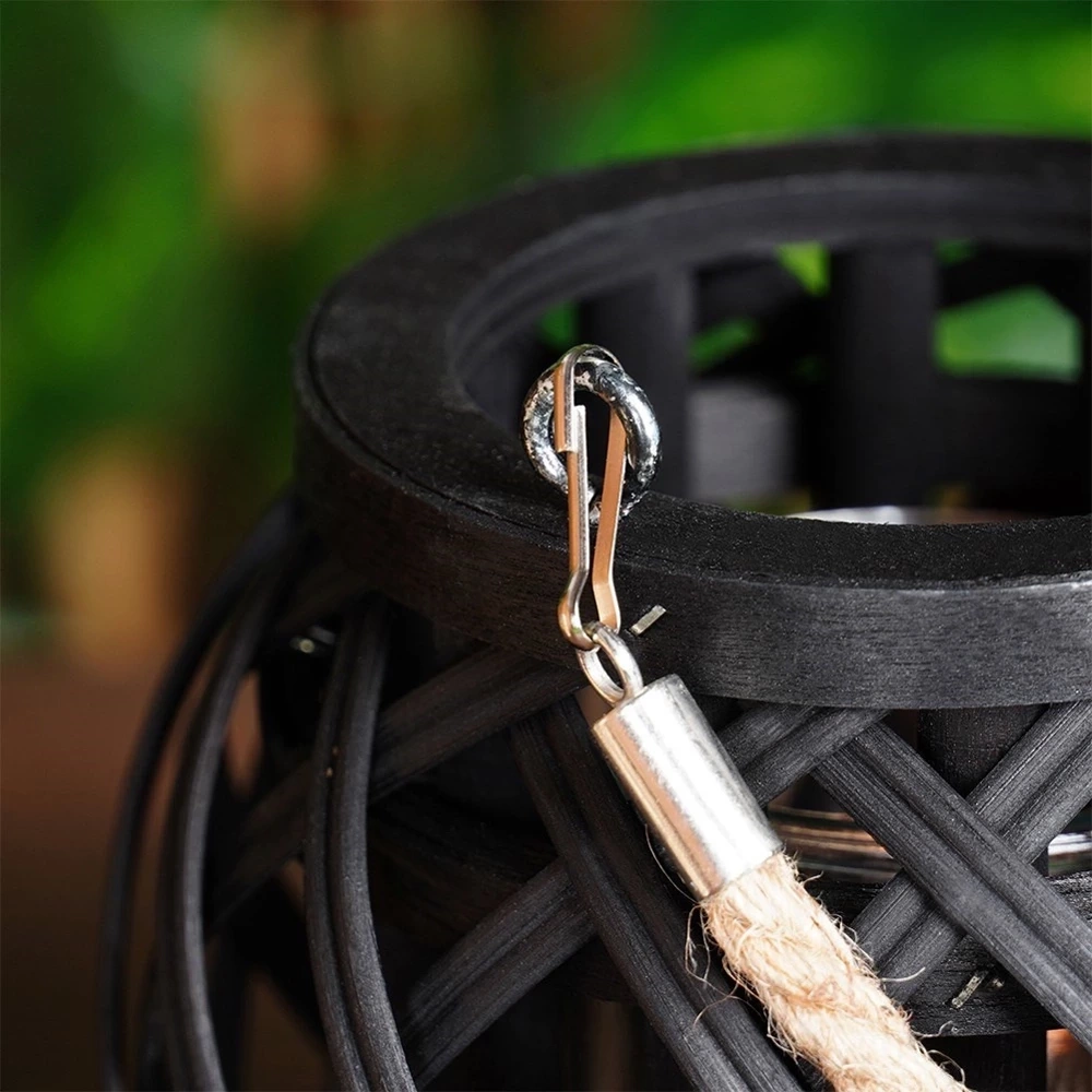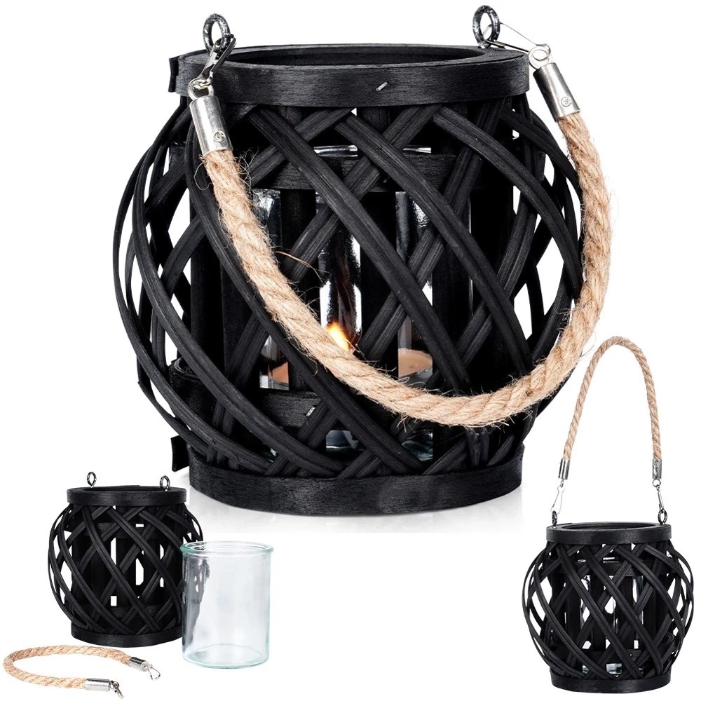 - Lampion na świeczkę w czarnym kolorze. Wykonany z bambusa, posiada szklany wkładem. Stanowi wyjątkowy element dekoracyjny ogrodu, mieszkania, domu, balkonu lub tarasu.