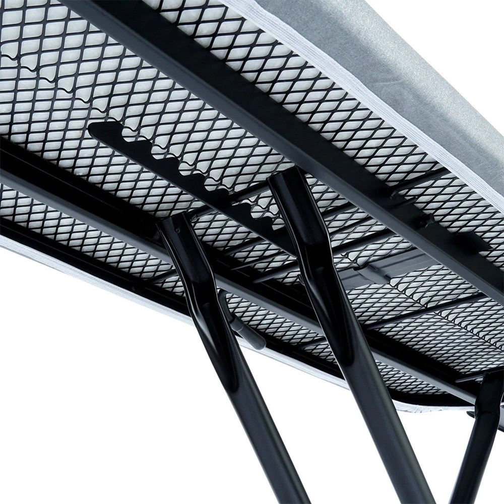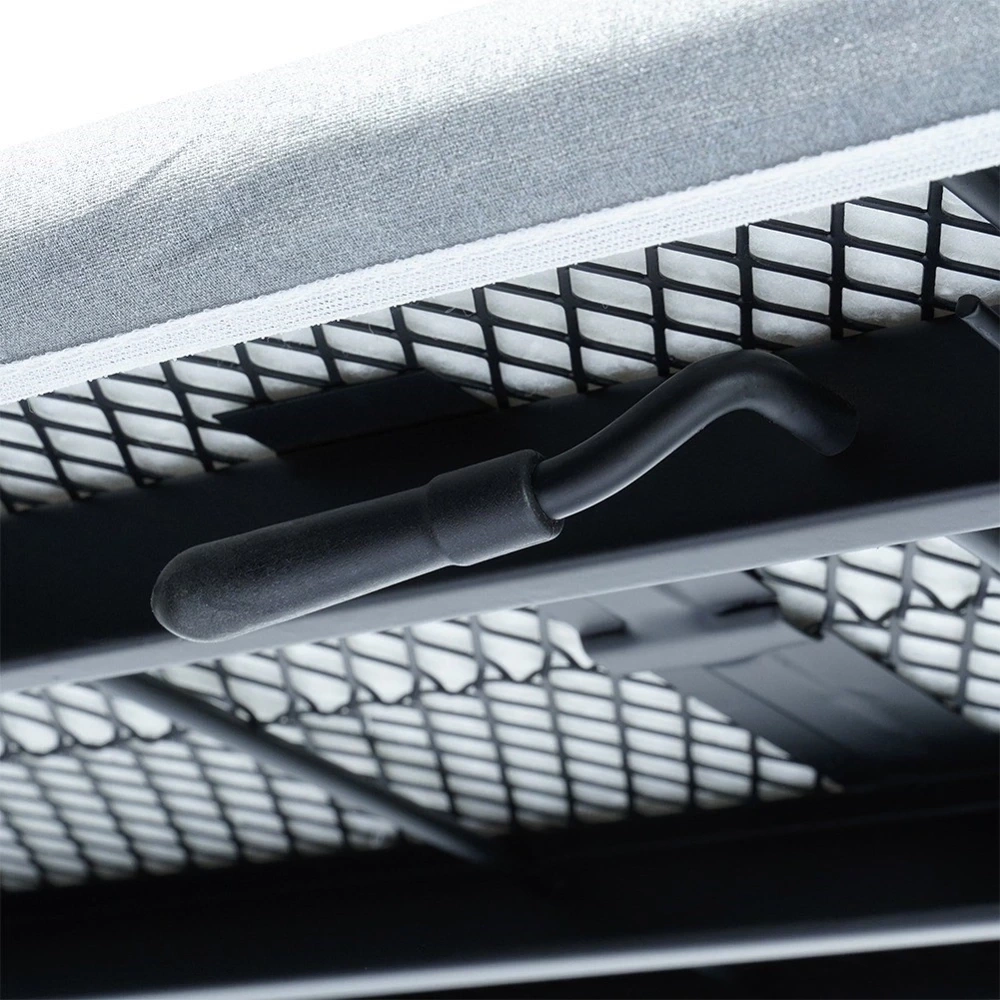 - FUNKCJONALNA - Deska posiada praktyczną podstawkę na żelazko z gumowymi elementami, odporną na wysokie temperatury. Dzięki siatkowej konstrukcji spodu deski nadaje się również do prasowania parowego.