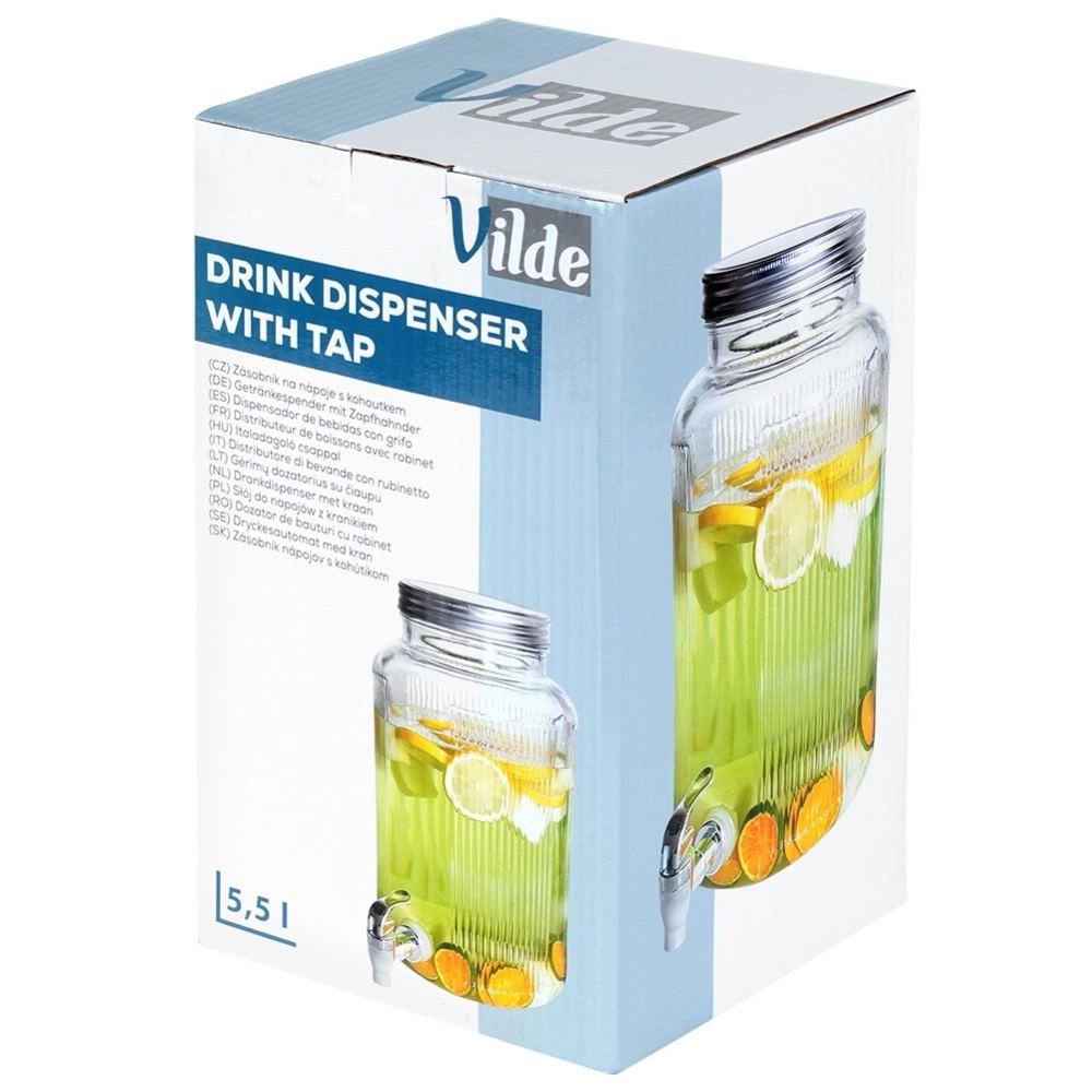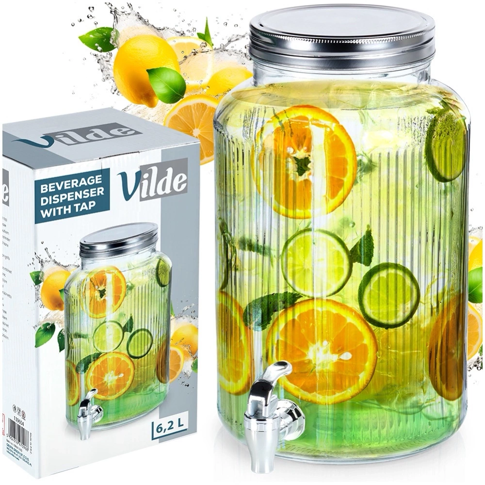 Szklany dystrybutor z kranikiem idealny do serwowania wody, lemoniady, soku, herbaty mrożonej, wody smakowej, ale również ponczu. Dzięki kranikowi w łatwy sposób zaserwujemy ulubione napoje w sposób efektowny. Słój wykorzystamy zarówno w ogrodzie, jak i podczas spotkań rodzinnych. Dzięki zamykanej pokrywie żadne owady nie dostaną się do naszego napoju. Wykonany jest z materiałów bezpiecznych dla zdrowia i neutralnych dla żywności. Nie nadaje się do napojów gorących. Uwaga! Na opakowaniu widnieje błędna informacja dot. pojemności, faktyczna pojemność jest zgodna z powyższym opisem. Oryginalny produkt marki Vilde. Wyprodukowano zgodnie z europejskimi standardami.