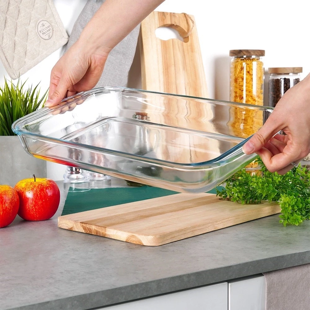- DO ZAPIEKANIA - Żaroodporne, prostokątne naczynie do pieczenia i zapiekania o pojemności całkowitej 3 l. Forma z uchwytami ma wymiary 39,5 x 24 x 5 cm.