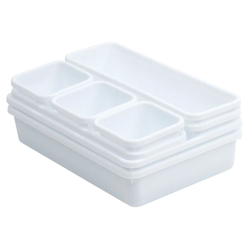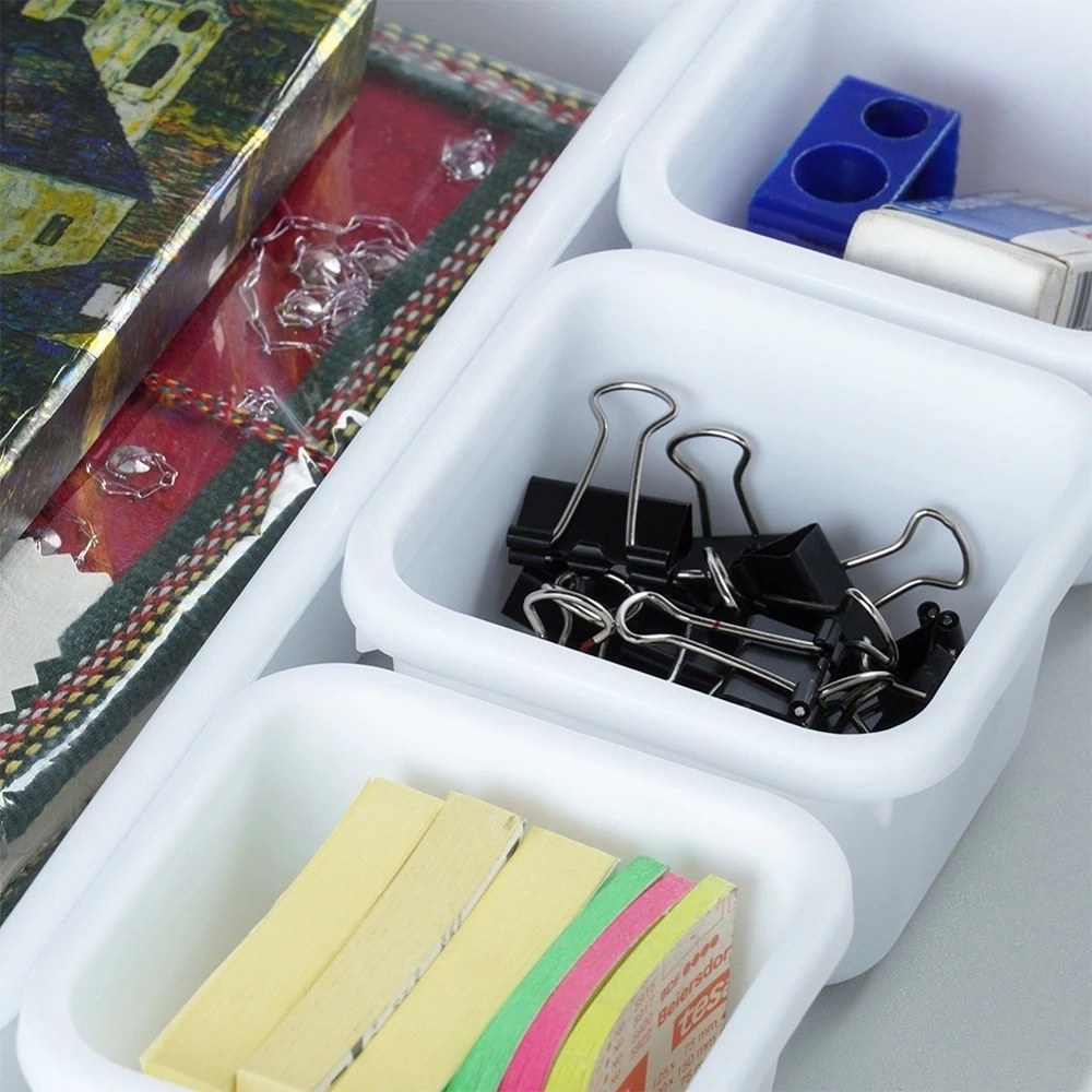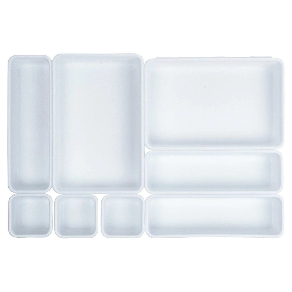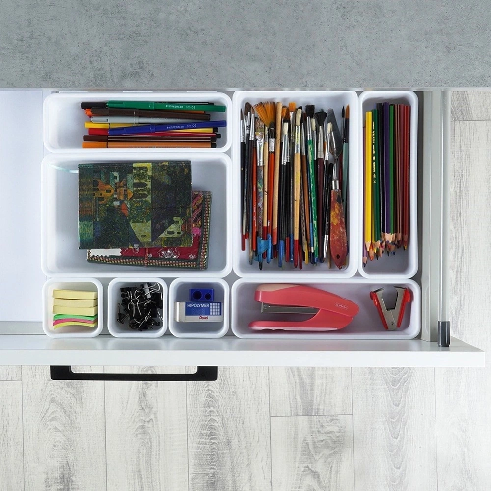 - Zestaw ośmiu organizerów do szuflady, w trzech różnych rozmiarach. Pojemniki możemy łączyć ze sobą. Idealne do przechowywania akcesoriów biurowych, drobnych elementów garderoby lub kosmetyków i biżuterii.