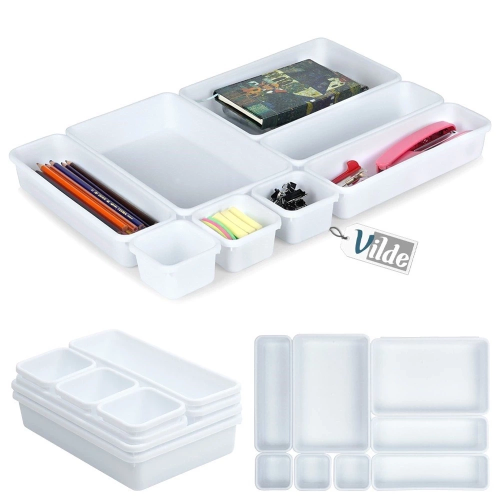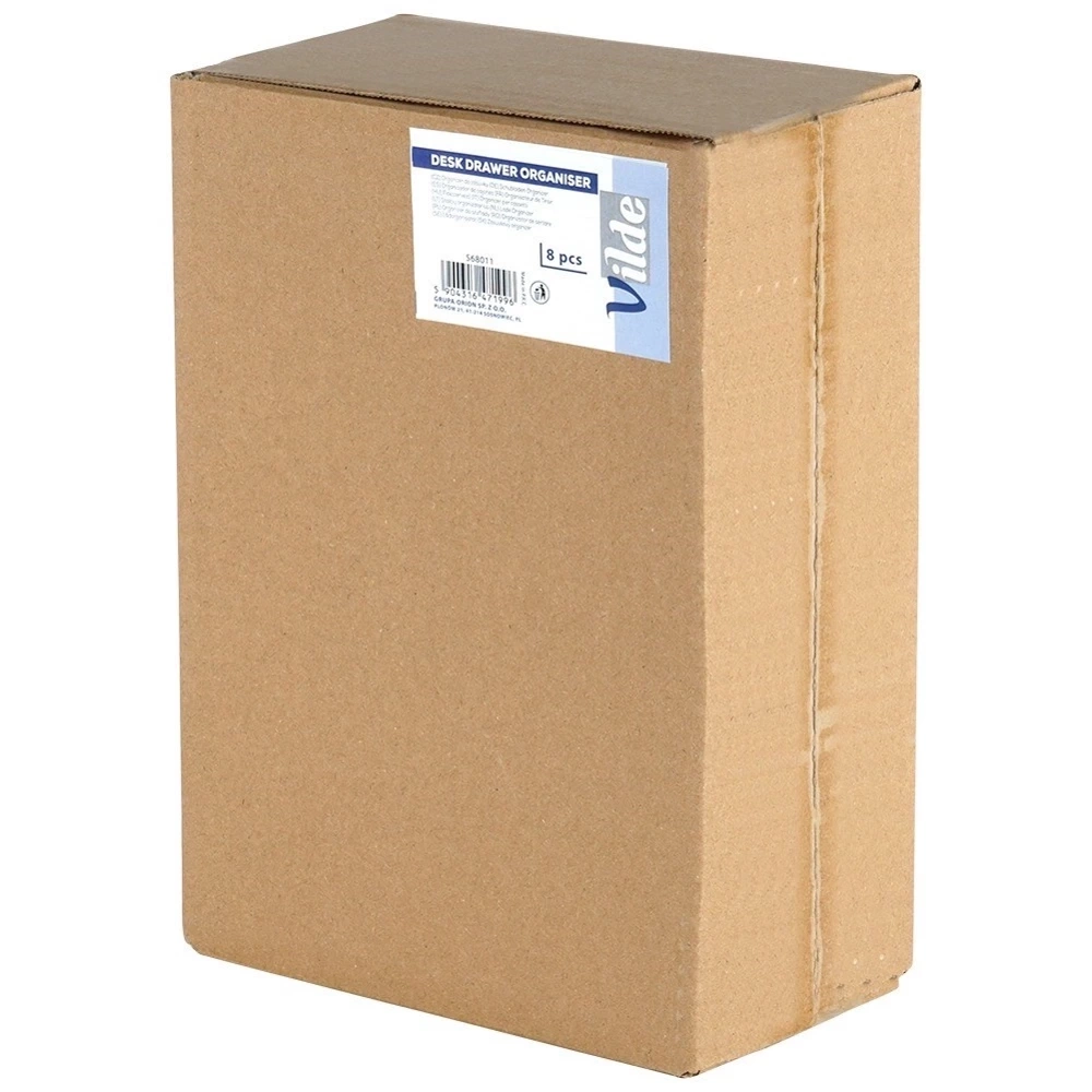 Zestaw ośmiu organizerów do szuflady. Idealne do przechowywania akcesoriów biurowych. W zestawie: 2x pojemnik duży (23,5 x 16 x 4,5 cm), 3x pojemnik średni (23,5 x 7,5 x 4,5 cm), 3x pojemnik mały (7,5 x 7,5 x 4,5 cm). Sprawdzą się również do przechowywania drobnych elementów garderoby, biżuterii lub kosmetyków. Dzięki modułowej wersji organizera, pojemniki możemy umieszczać w dowolnym miejscu. Oryginalny produkt marki Vilde. Wyprodukowano zgodnie z europejskimi standardami.