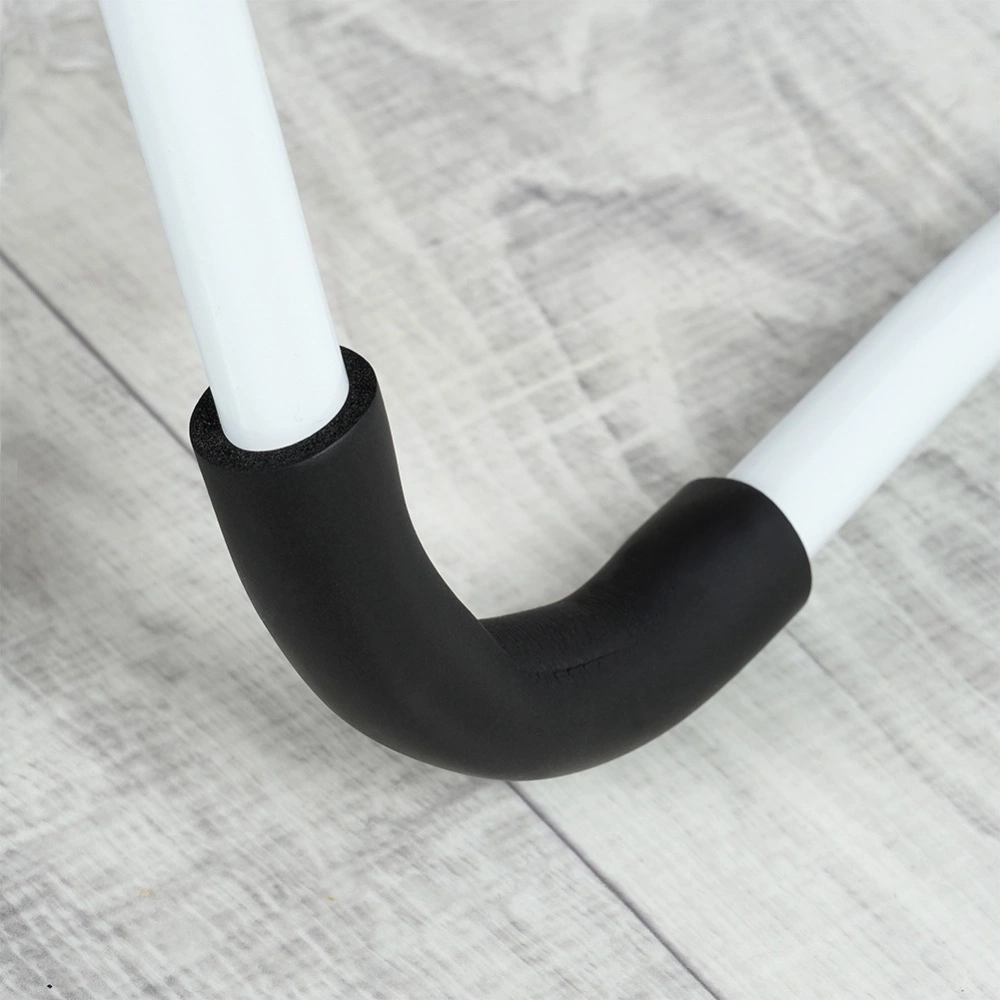 - Stabilna konstrukcja z antypoślizgowymi nóżkami - Stelaż stolika wykonany z metalu w białym kolorze, posiada gumowe elementy na nóżkach, które są antypoślizgowe. Blat stolika wykonany z płyty MDF w odcieniach szarości.