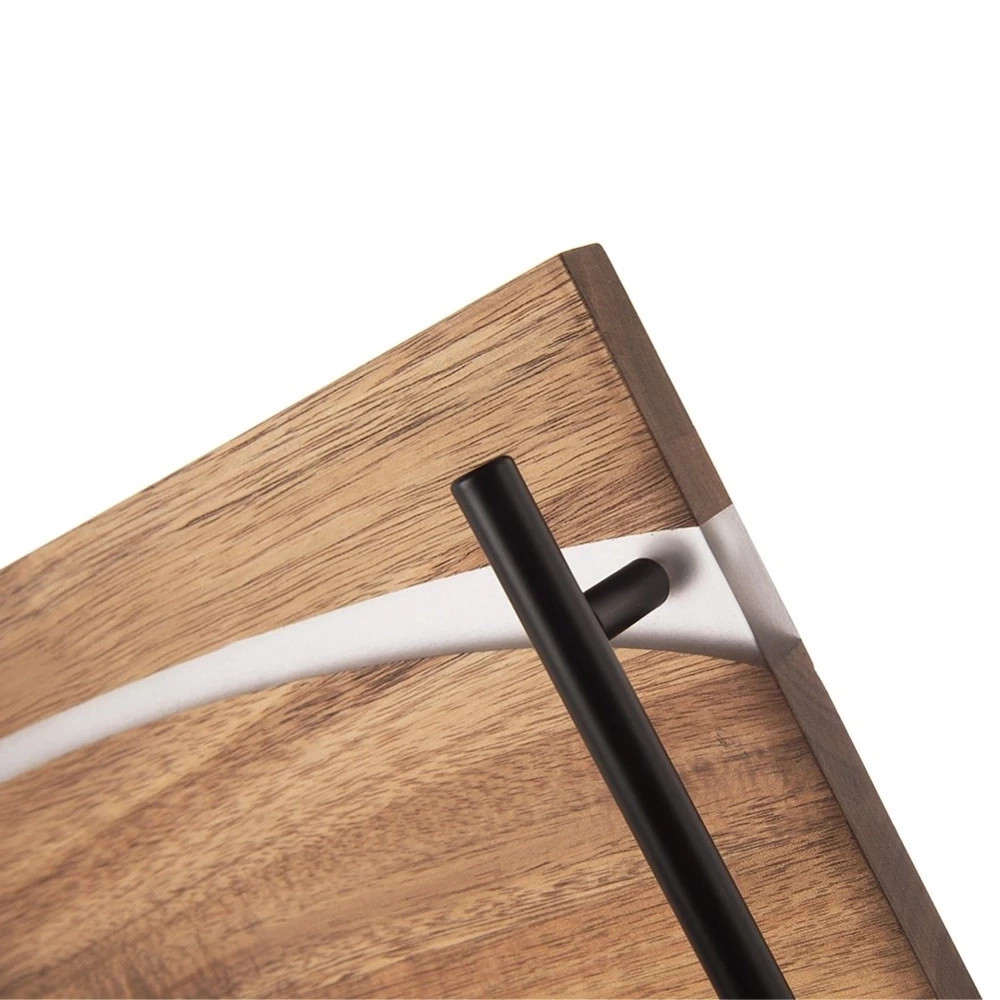 - Prostokątna taca do serwowania dań i przekąsek. Wykonana z drewna akacjowego a uchwyty z metalu w czarnym kolorze. Niezwykle solidna.