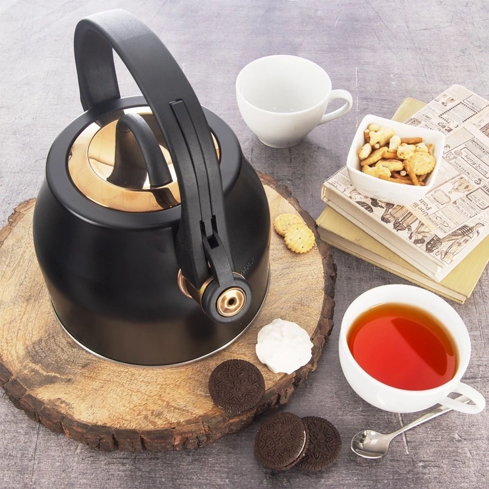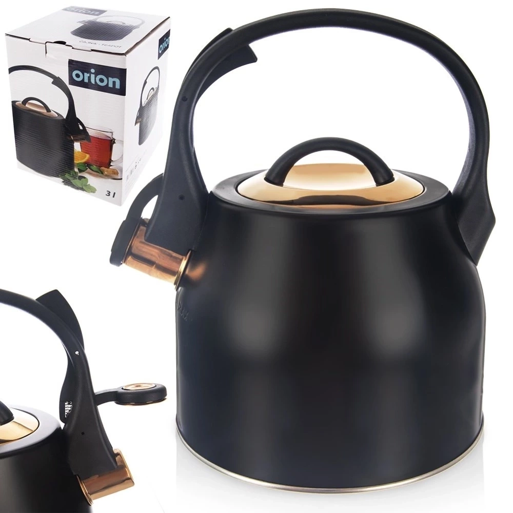 - Czajnik z uchylnym gwizdkiem. Wykonany ze stali nierdzewnej w matowym, czarnym kolorze z dodatkami w kolorze złotym. Do stosowania na wszystkich rodzajach kuchenek.