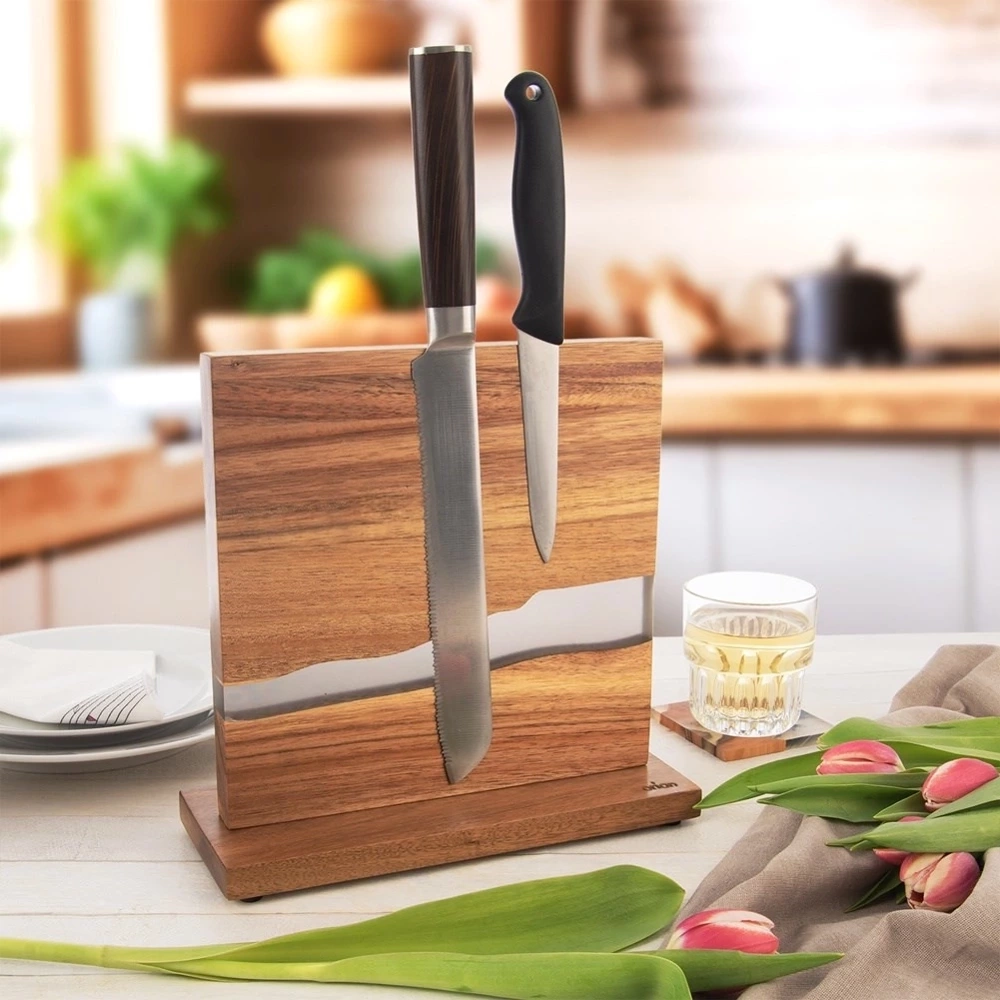 - Uniwersalny, magnetyczny stojak na noże oraz metalowe przybory kuchenne, możemy umieszczać je na nim z dwóch stron. Wykonany z drewna akacjowego.