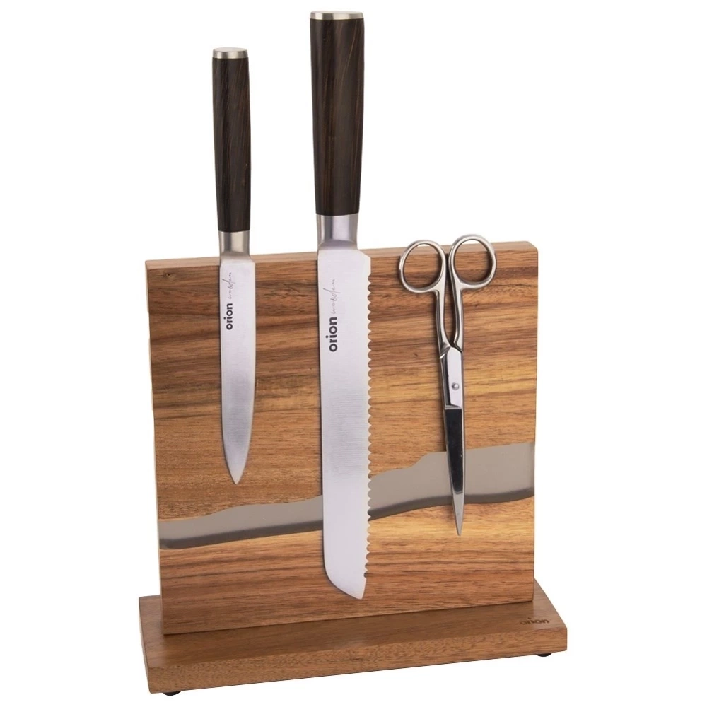 Dwustronny, magnetyczny stojak na noże kuchenne. Niezwykle efektowny, będzie ozdobą każdej kuchni, jednocześnie umożliwiając odpowiednie przechowywanie noży oraz akcesoriów kuchennych. Posiada nowoczesny design, dzięki czemu będzie pasował do kuchni w stylu nowoczesnym, ale również w stylu klasycznym. Oryginalny produkt czeskiej marki Orion. Wyprodukowano zgodnie z europejskimi standardami.