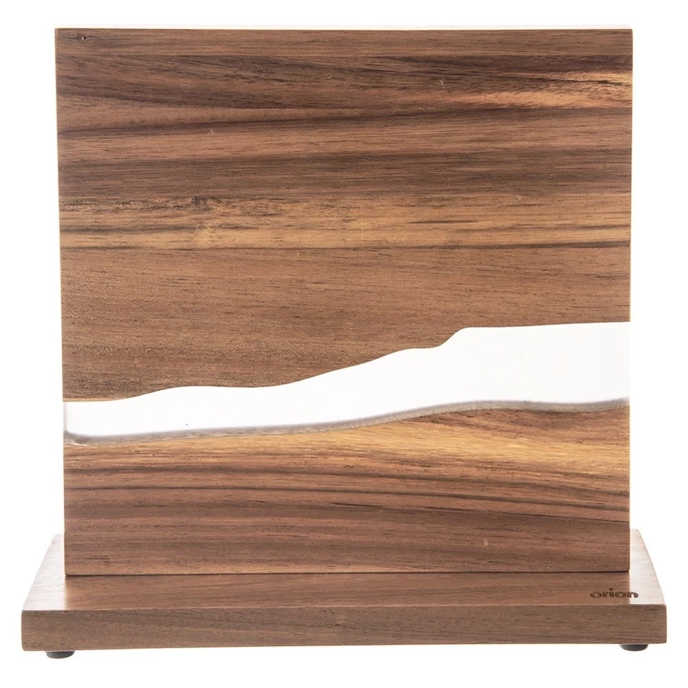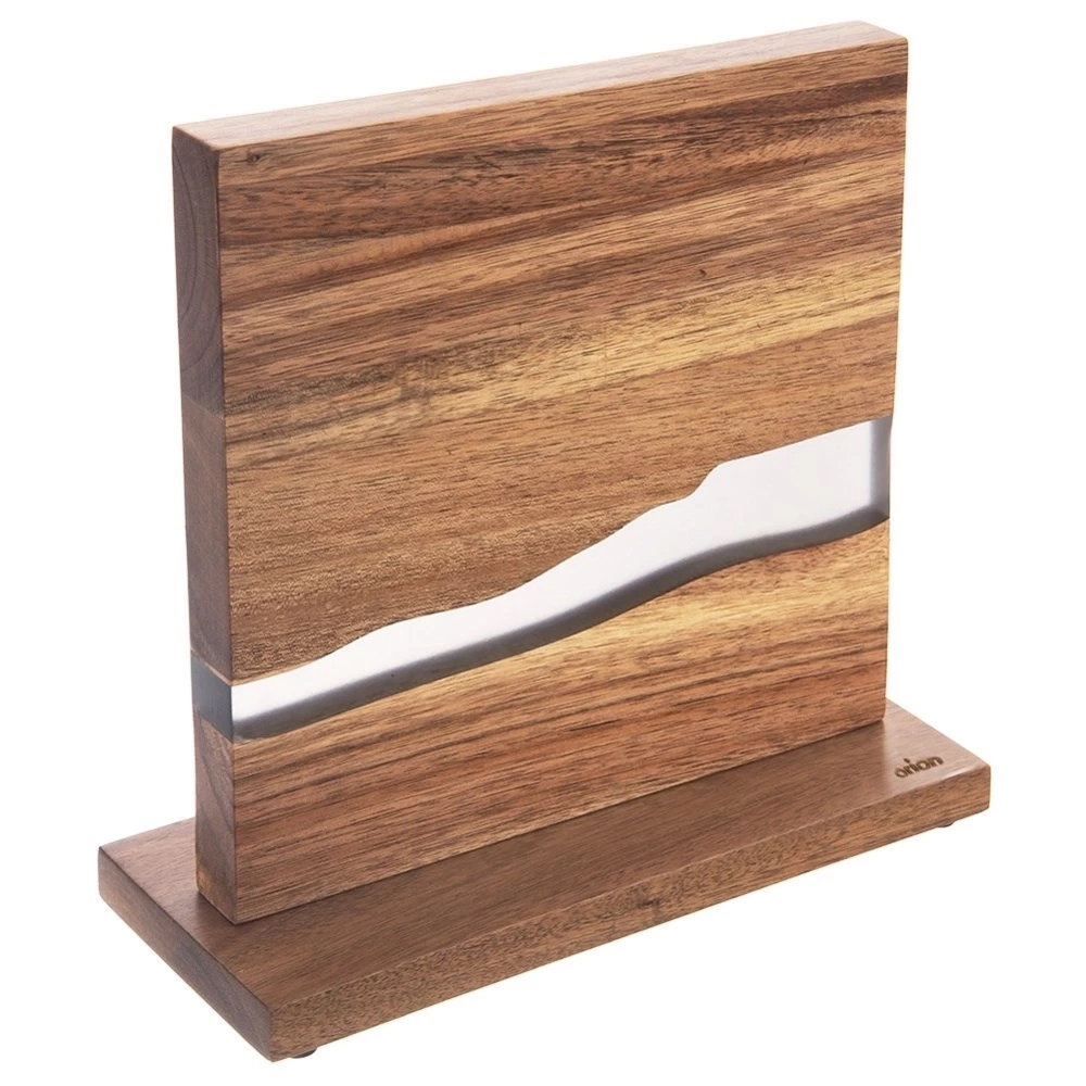 - Wykonany z drewna akacjowego - Stojak na noże, nożyczki oraz inne metalowy przybory kuchenne. Wykonany z naturalnego drewna akacjowego z elementami żywicy, która jest osadzona w drewnie, a swoim kształtem przypomina rzekę. Drewno akacjowe, jest materiałem ekologicznym i bezpiecznym dla zdrowia. Stojak ma wymiary 24 x 9,5 x 23,5 cm. Pozwoli na wygodne przechowywanie noży. Stojak z serii River.