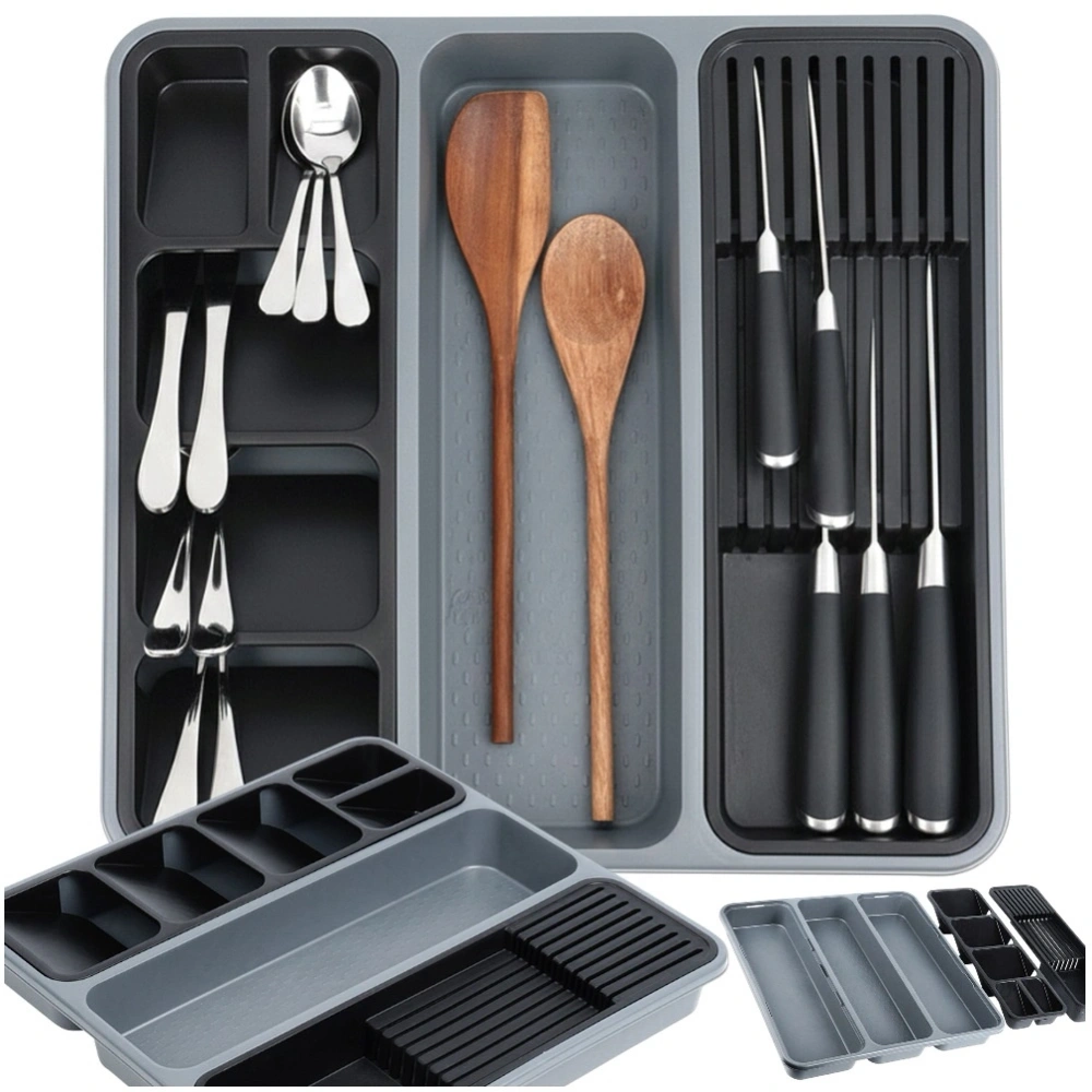 - Dedykowane wkłady na sztućce i noże - Wkład do szuflady wyposażony jest w dwa wyciągane wkłady. Jeden z wkładów pozwoli uporządkować i umieścić w nim 9 noży, a drugi świetnie sprawdzi się do segregacji sztućców, co pozwoli oddzielnie umieścić je w organizerze. Wkłady możemy wyciągać.
