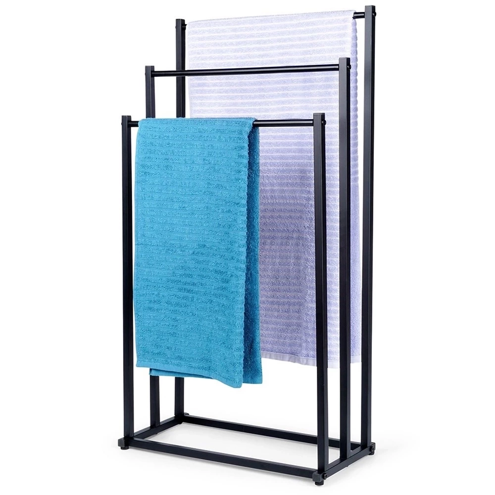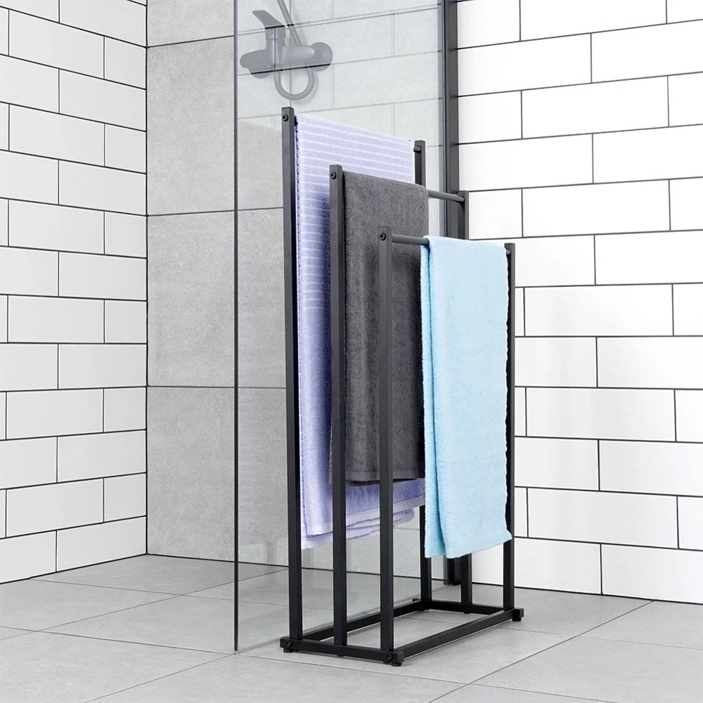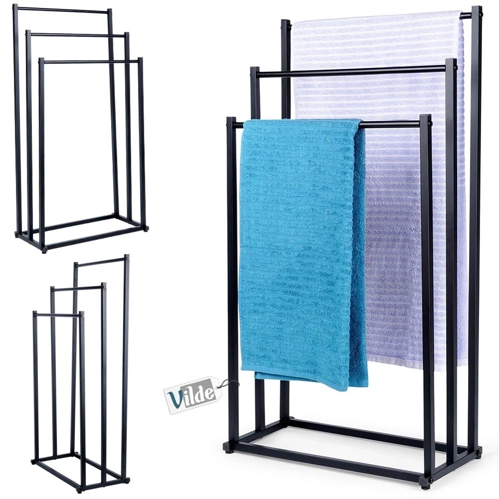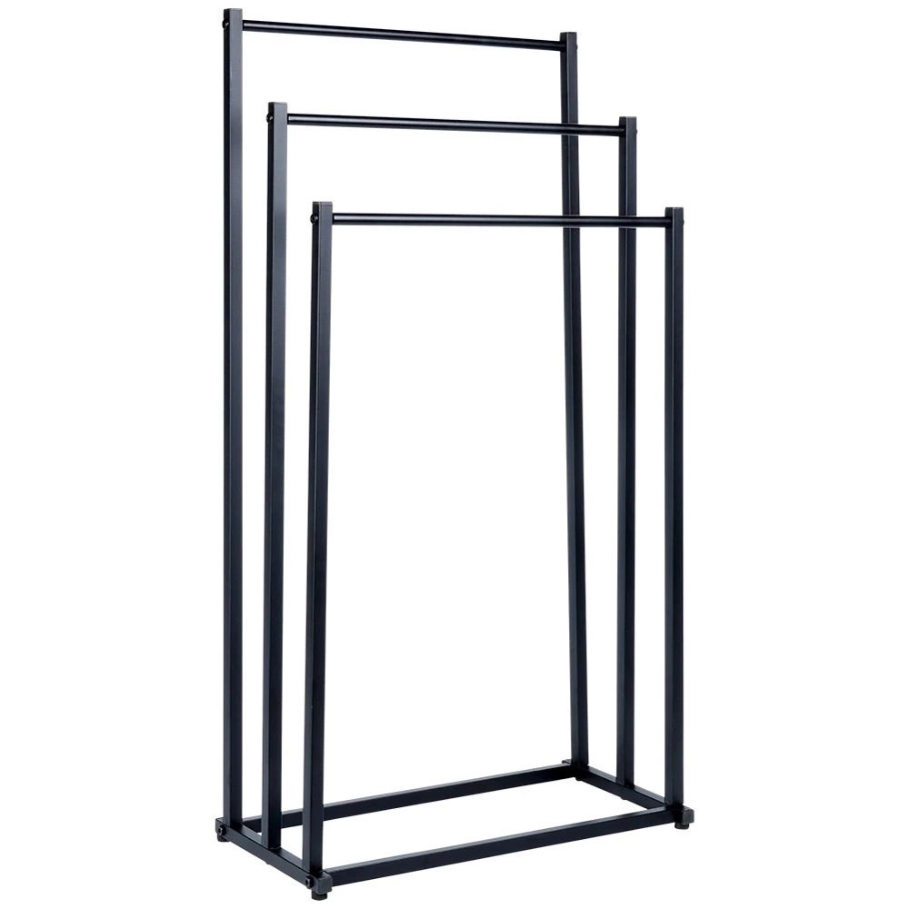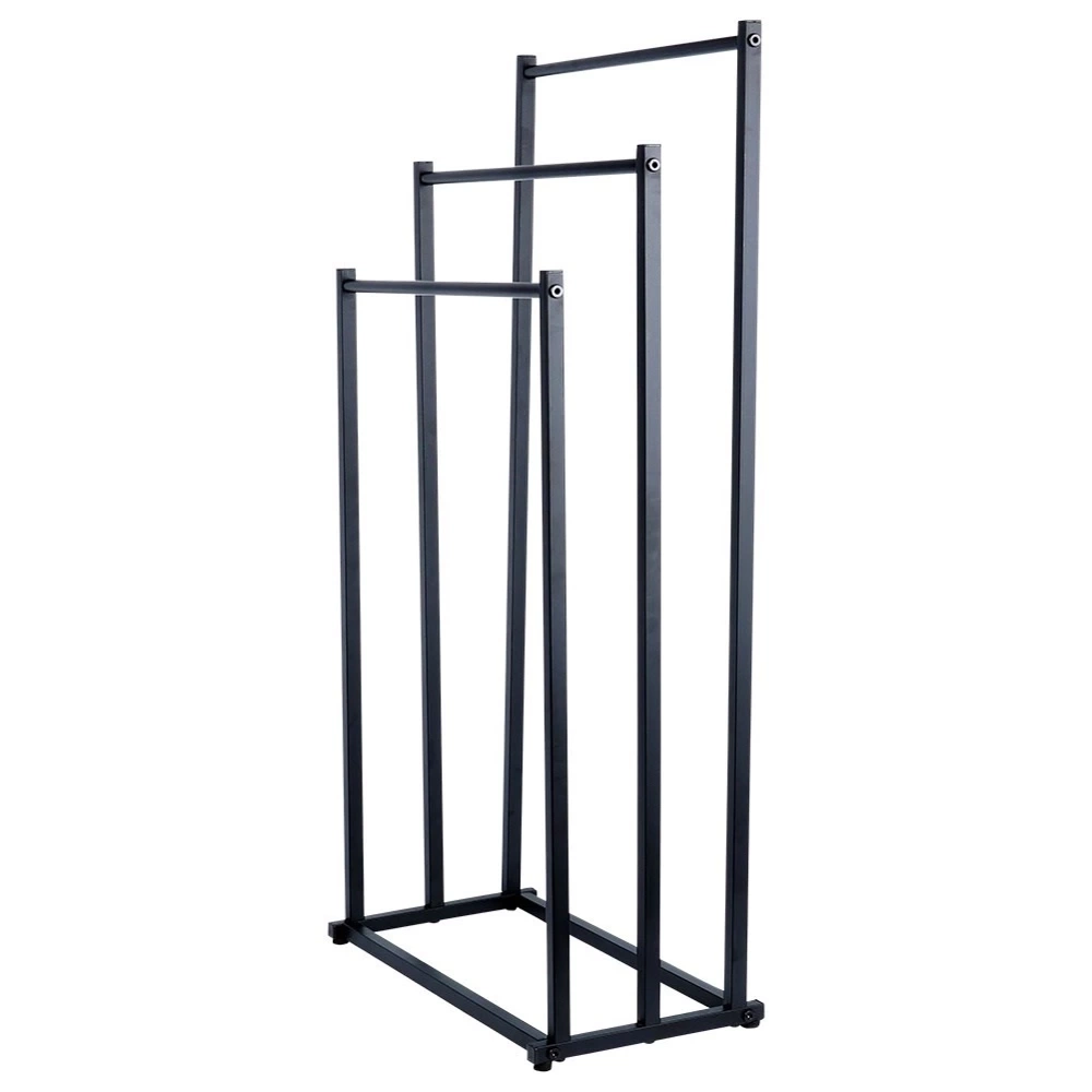 - Praktyczny, wolnostojący wieszak na ręczniki lub ubrania. Posiada 3 poprzeczki do zawieszenia. Wykonany z metalu w kolorze czarnym.