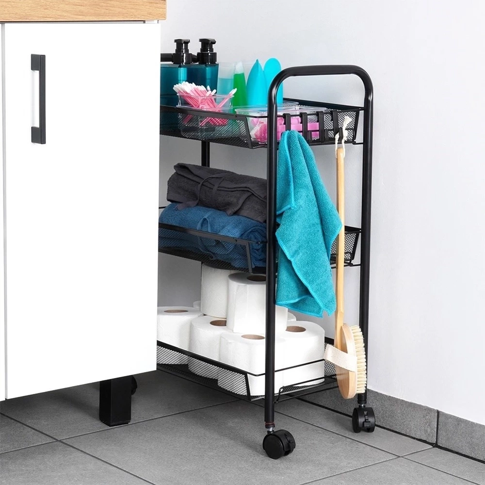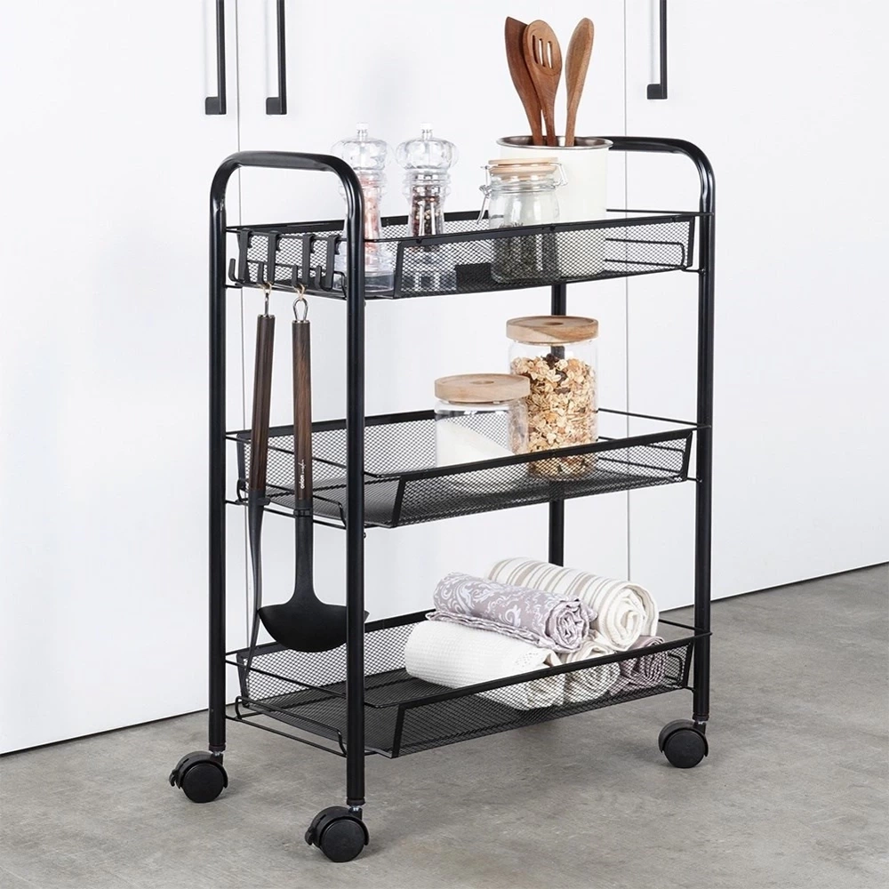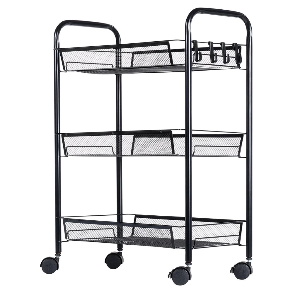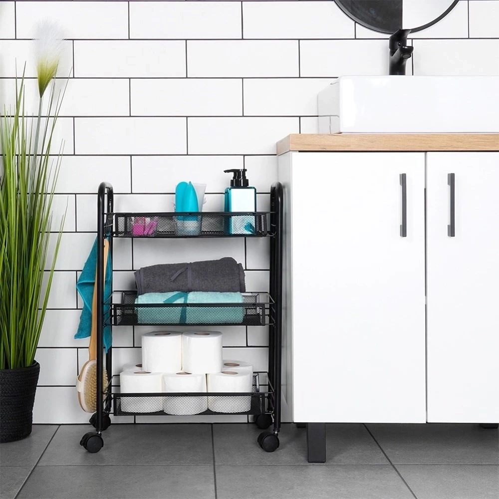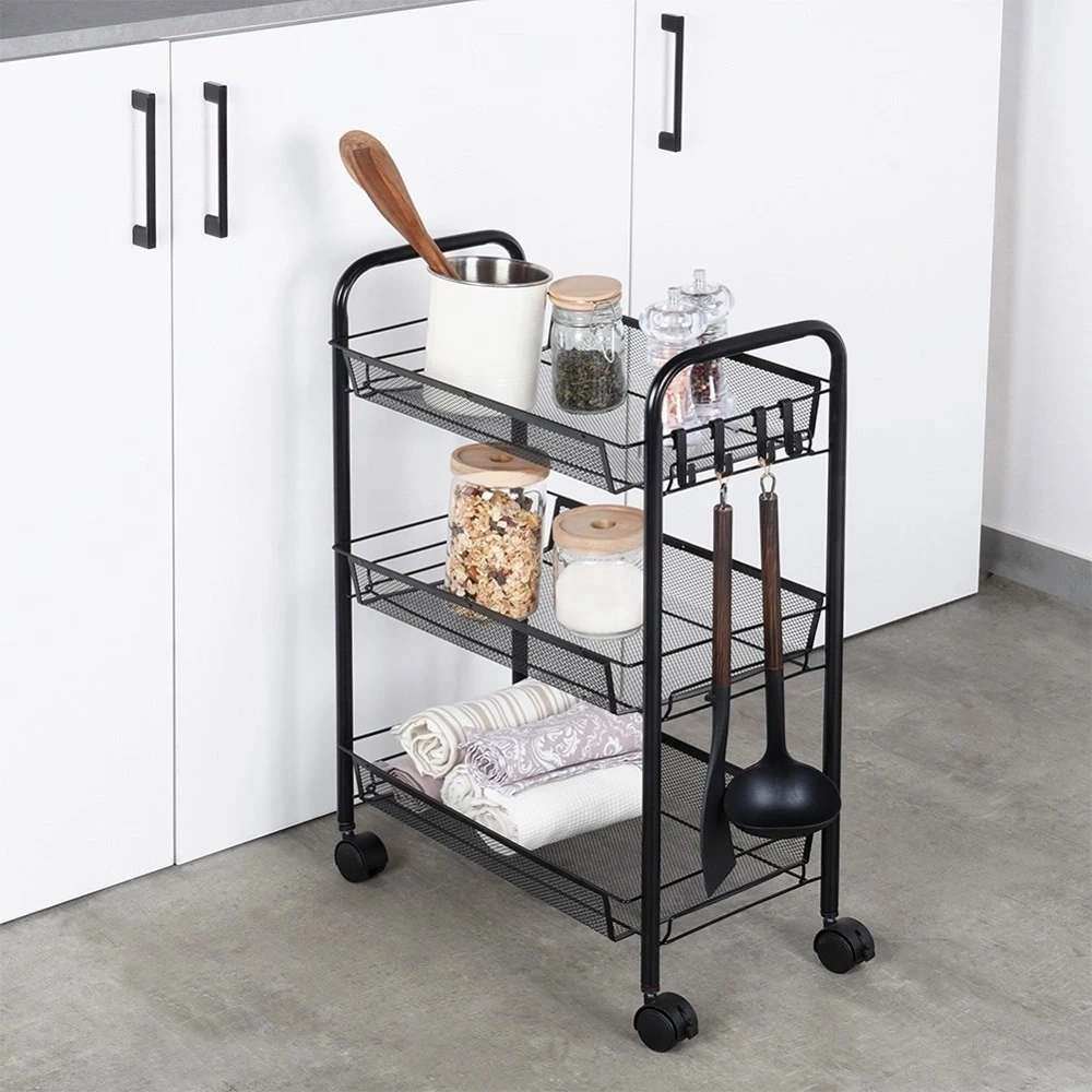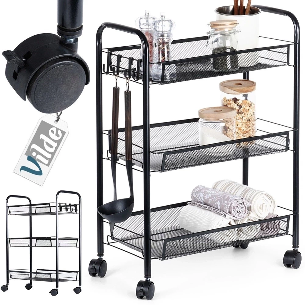 - Praktyczny 3-piętrowy wózek na kółkach. Znajdzie zastosowanie w domu, warsztacie i biurze. Wykonany z metalu w czarnym kolorze.