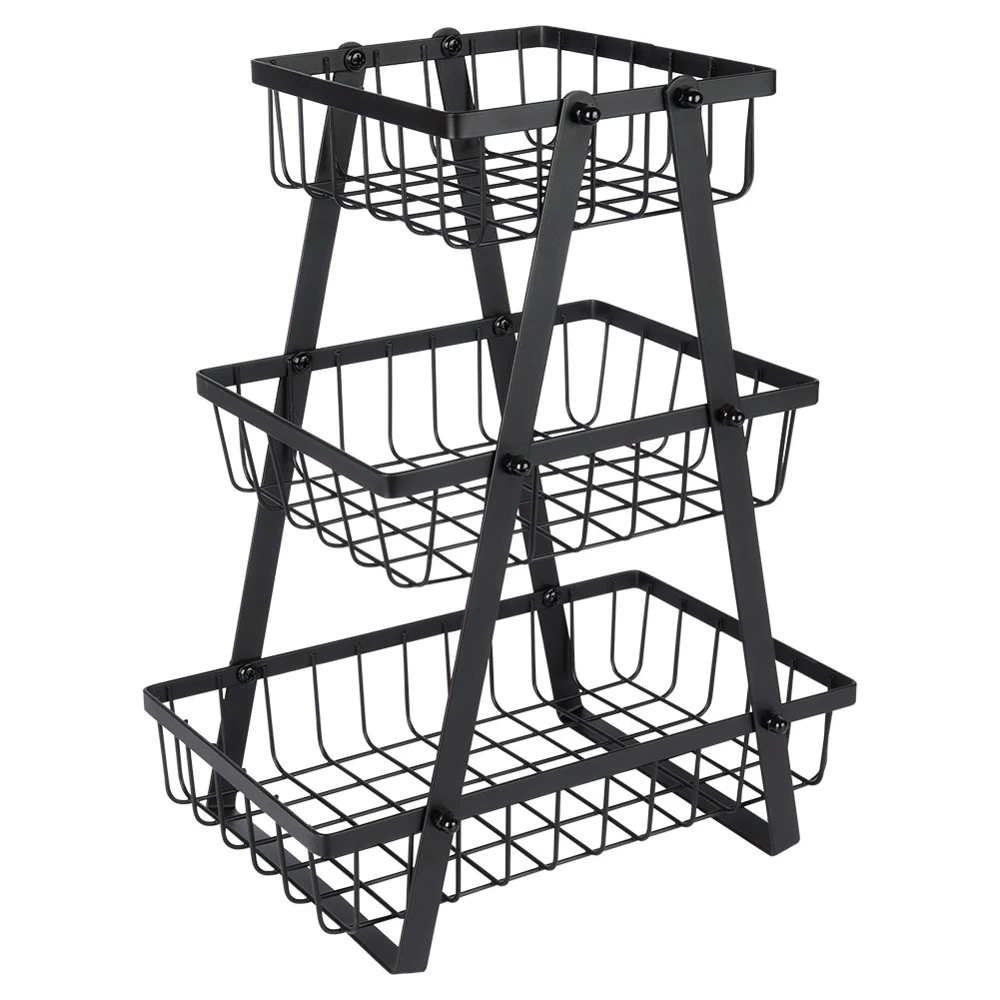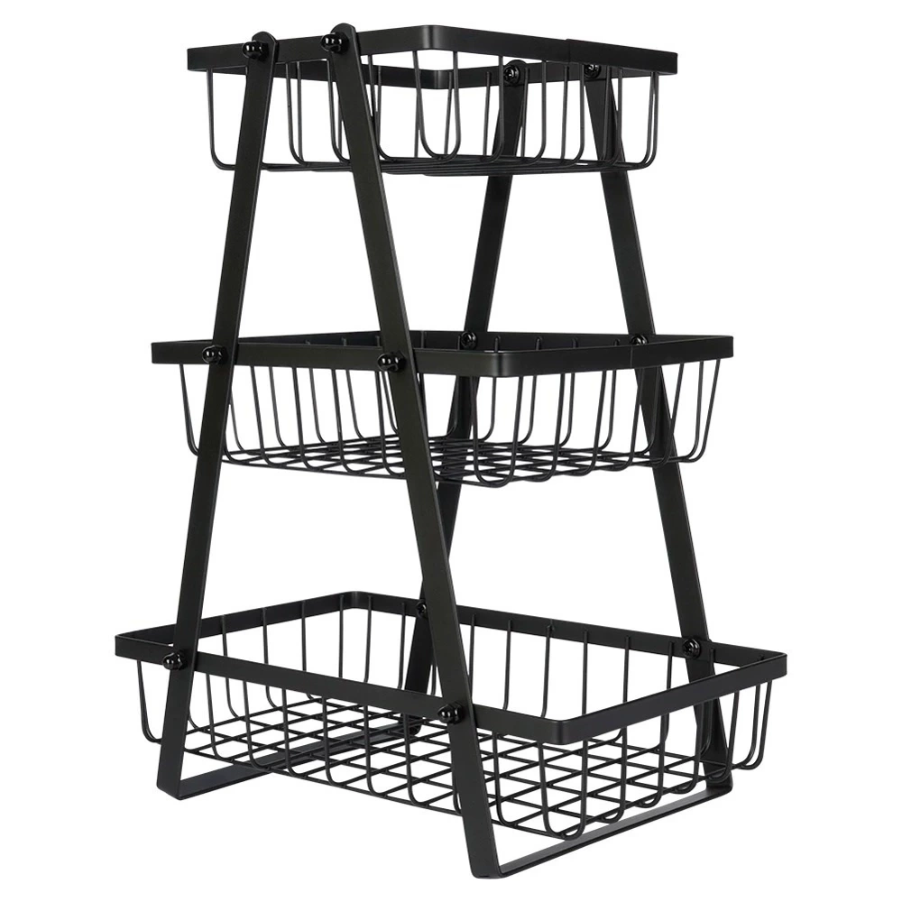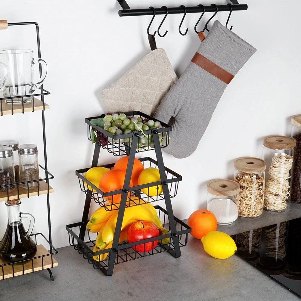 - Trzypoziomowy koszyk na owoce i warzywa w stylu loft. Wykonany z metalu w kolorze czarnym. Znajdzie zastosowanie w każdej kuchni.