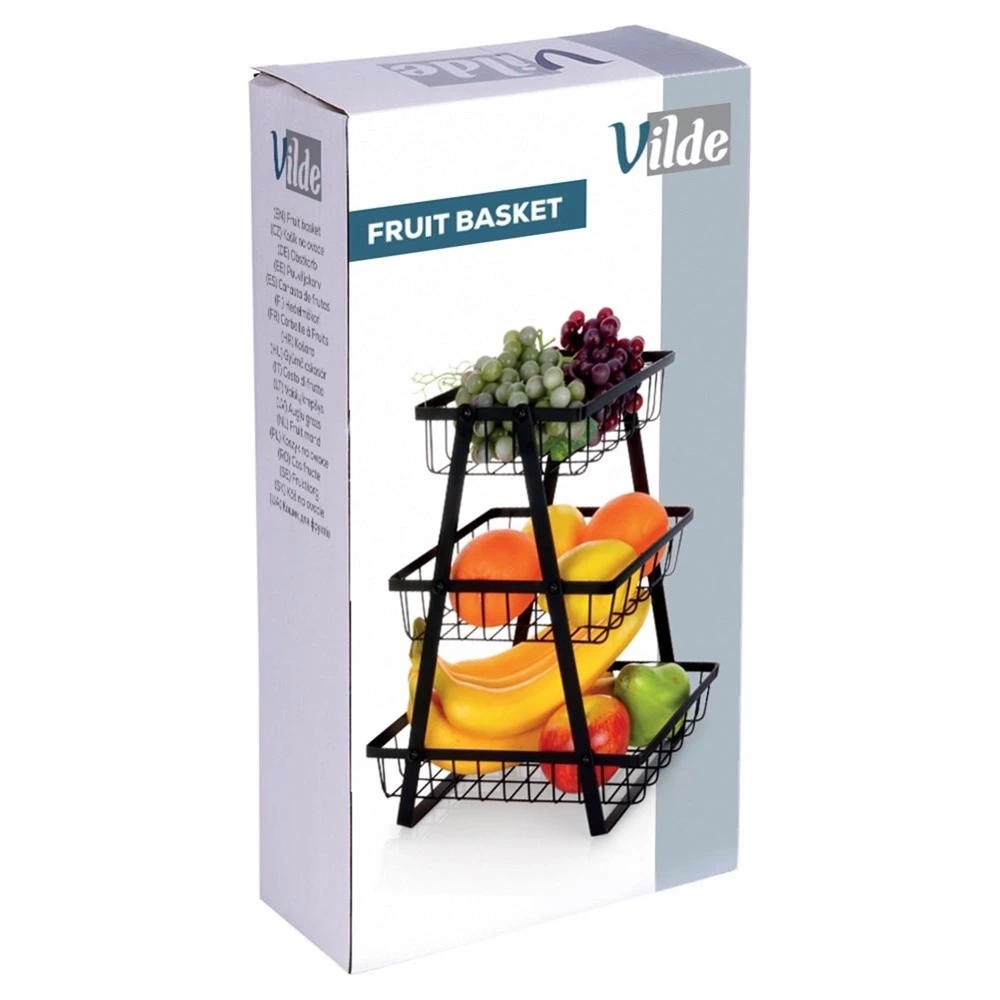 Praktyczny, trzypoziomowy koszyk na owoce i warzywa. Wykonany z wytrzymałych materiałów. Koszyk jest wielofunkcyjny i może być również wykorzystywany do przechowywania drobnych produktów codziennego użytku czy artykułów biurowych. Jest stabilny, praktyczny i poręczny, wyposażony w wygodne uchwyty, które ułatwią przenoszenie. Koszyk na owoce utrzymany w modnym stylu, więc efektownie prezentuje się w każdym wnętrzu. Idealny do każdej kuchni oraz jadalni. Oryginalny produkt marki Vilde. Wyprodukowano zgodnie z europejskimi standardami.
