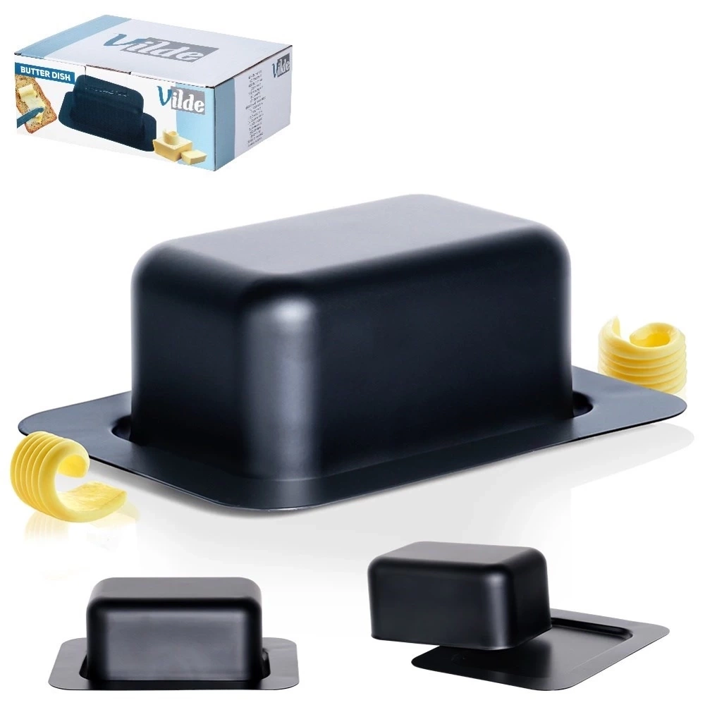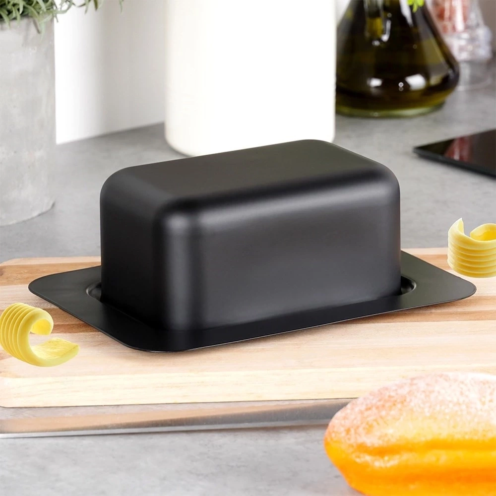 - Maselniczka wykonana w całości ze stali w czarnym, matowym kolorze. Idealna do przechowywania i serwowania masła. Posiada klasyczny kształt pasujący do każdej zastawy.