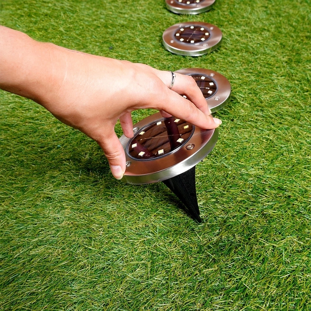 - Zestaw 12 lampek solarnych o białej barwie światła - Zestaw składa się z dwunastu lamp, każda wyposażona w 8x diodę LED, która emituje jasne, białe światło. Idealnie nadają się do oświetlenia ogrodu, ścieżek czy podjazdów. Lampki wykonane ze stali nierdzewnej a kotwa z tworzywa w kolorze czarnym. Srebrne lampki i czarne mocowania tworzą elegancki efekt, który podkreśla urok ogrodu. Lampa ma wysokość 13,5 cm wraz z kotwą a po wbiciu do ziemi ma wysokość 2 cm, średnica lampki wynosi 11,5 cm.
