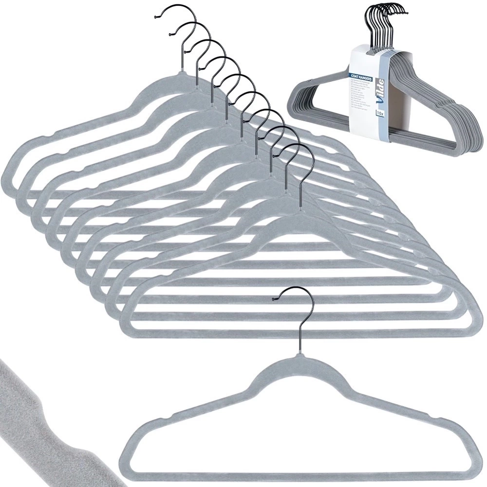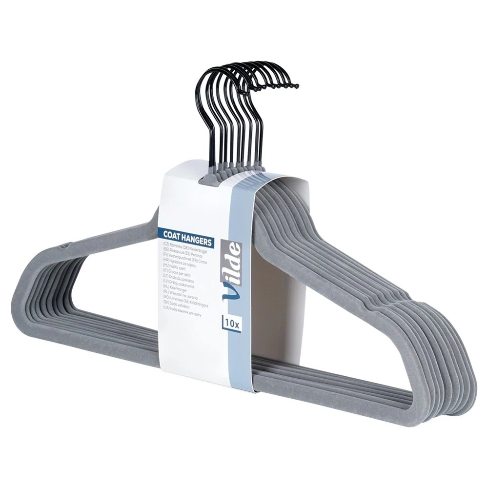 - Zestaw 10 wieszaków na ubrania - Zestaw 10 uniwersalnych wieszaków na ubrania w kolorze szarym. Idealne dla osób ceniących praktyczne rozwiązania, pomogą zorganizować odpowiednio przestrzeń w szafie. Wieszaki są niezbędne w każdym domu a także sklepie z odzieżą. Dzięki nim wygodnie zawiesimy ubrania w szafie. Każdy wieszak ma wymiary 45 x 24,5 x 0,5 cm.