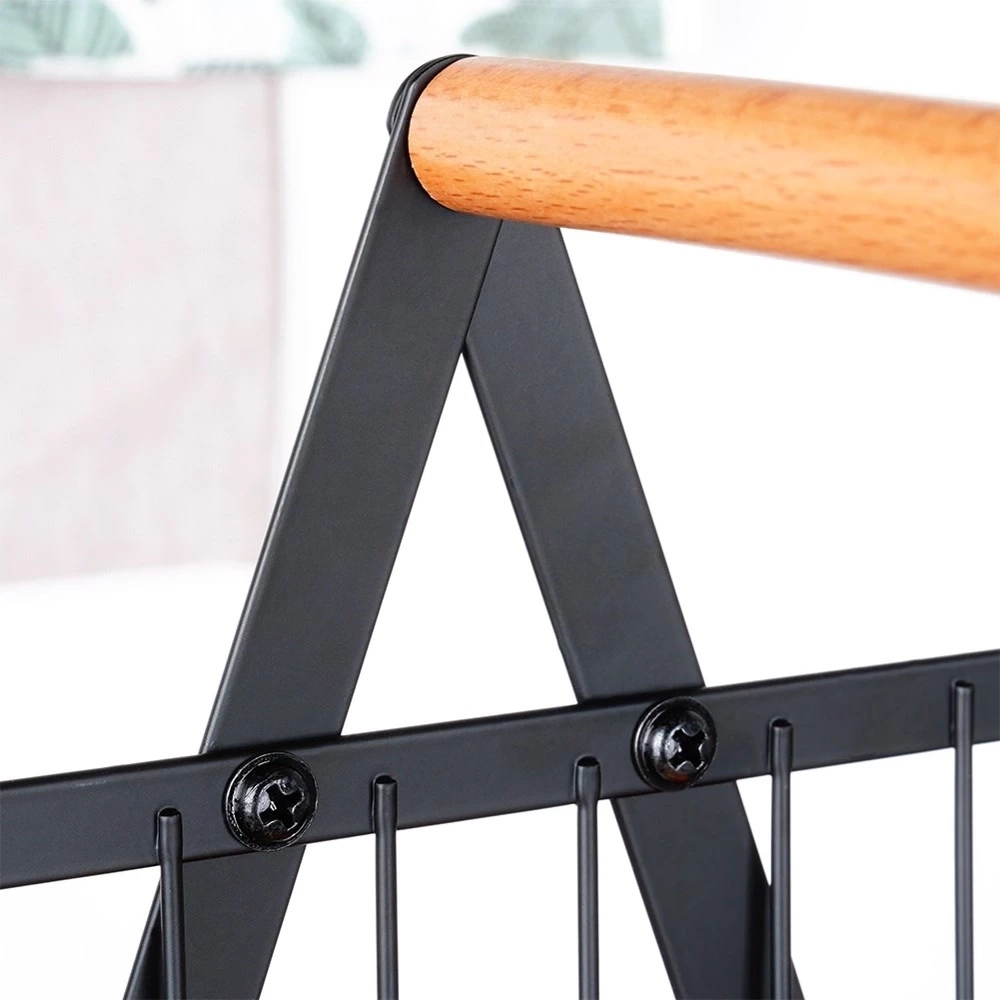 - Wykonany z metalu - Koszyk jest wytrzymały oraz stabilny. Wykonany z najwyższej jakości metalu w matowym, czarnym kolorze a uchwyt wykonany z drewna.
