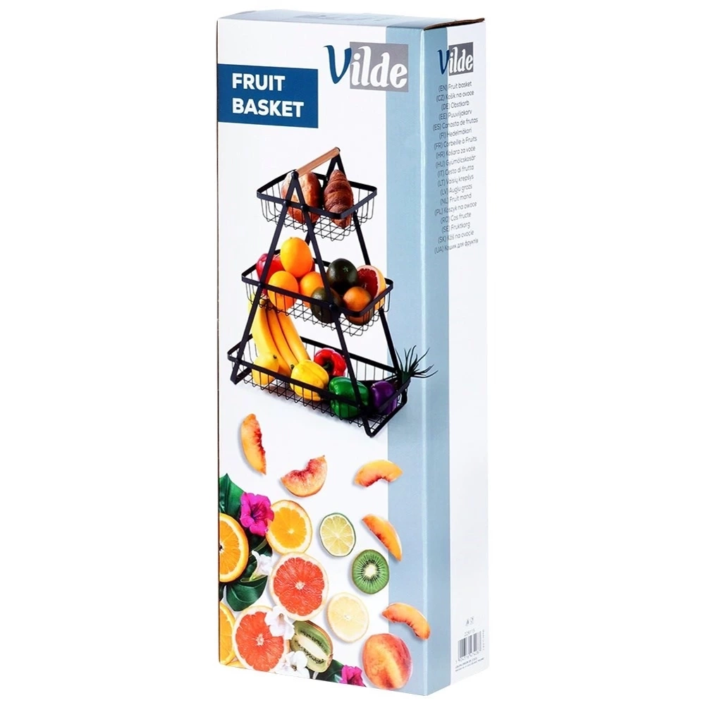 Praktyczny, trzypoziomowy koszyk na owoce i warzywa. Wykonany z wytrzymałych materiałów. Koszyk jest wielofunkcyjny i może być również wykorzystywany do przechowywania drobnych produktów codziennego użytku czy artykułów biurowych. Jest stabilny, praktyczny i poręczny, wyposażony w wygodny uchwyt, który ułatwi przenoszenie. Koszyk na owoce utrzymany w modnym stylu, więc efektownie prezentuje się w każdym wnętrzu. Idealny do każdej kuchni oraz jadalni. Oryginalny produkt marki Vilde. Wyprodukowano zgodnie z europejskimi standardami.