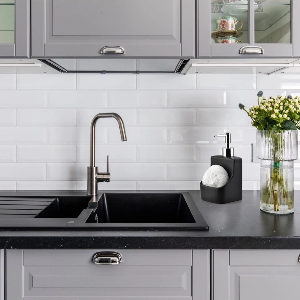- Wykonany z ceramiki w czarnym kolorze - Wykonany z najwyższej jakości ceramiki w modnym czarnym, matowym kolorze. Niezwykle efektownie prezentuje się w kuchni. Dozownik wykonany z tworzywa w kolorze srebrnym.