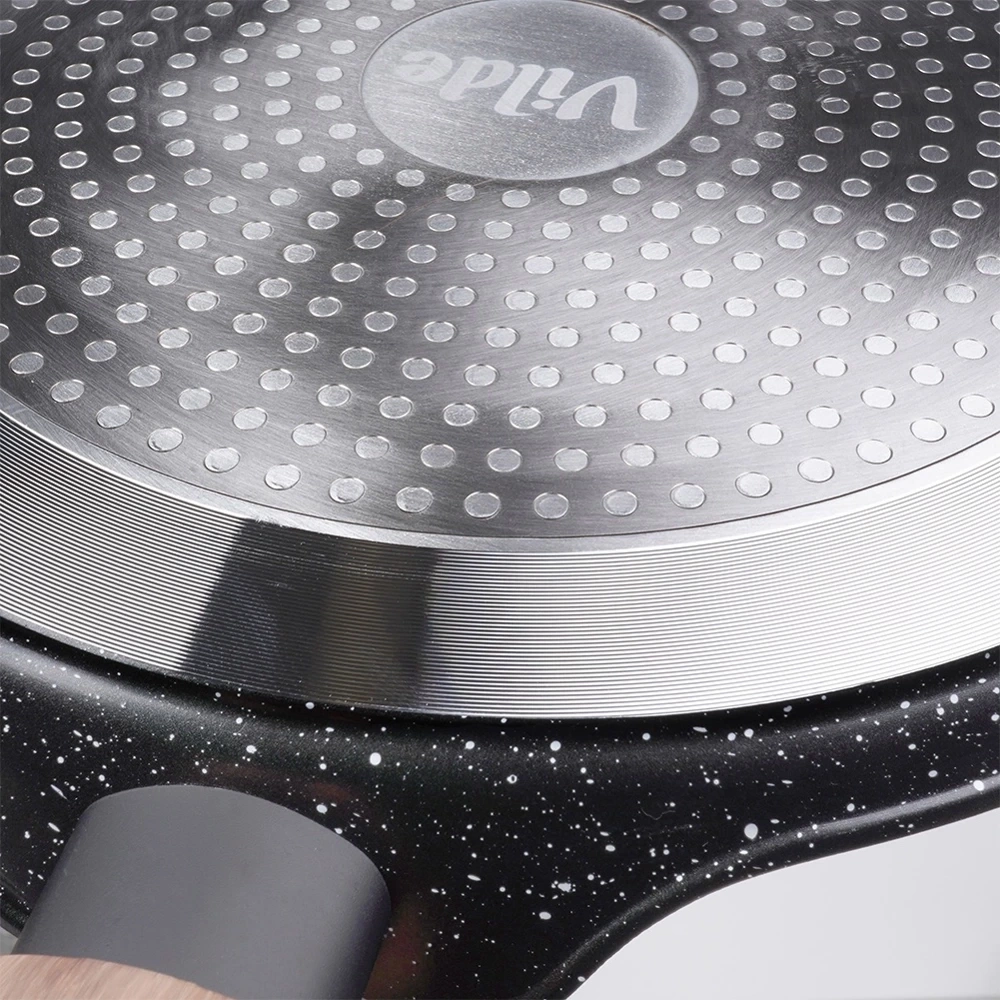 Nieprzywierająca patelnia do naleśników o wyjątkowym, ponadczasowym wyglądzie. Patelnia utrzymana w modnym połączeniu czerni z drewnem, dzięki czemu efektownie prezentuje się w kuchni. Z jej pomocą usmażymy pyszne naleśniki, placki, jak i omlety. Niezastąpiona w każdej kuchni, ułatwia gotowanie i nadaje potrawom perfekcyjny wygląd. Wykonana z najwyższej jakości materiałów, odpowiednio użytkowana posłuży długie lata. Oryginalny produkt marki Vilde z linii Black&Wood. Wyprodukowano zgodnie z europejskimi standardami.