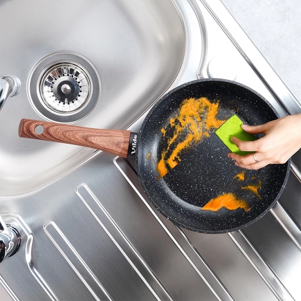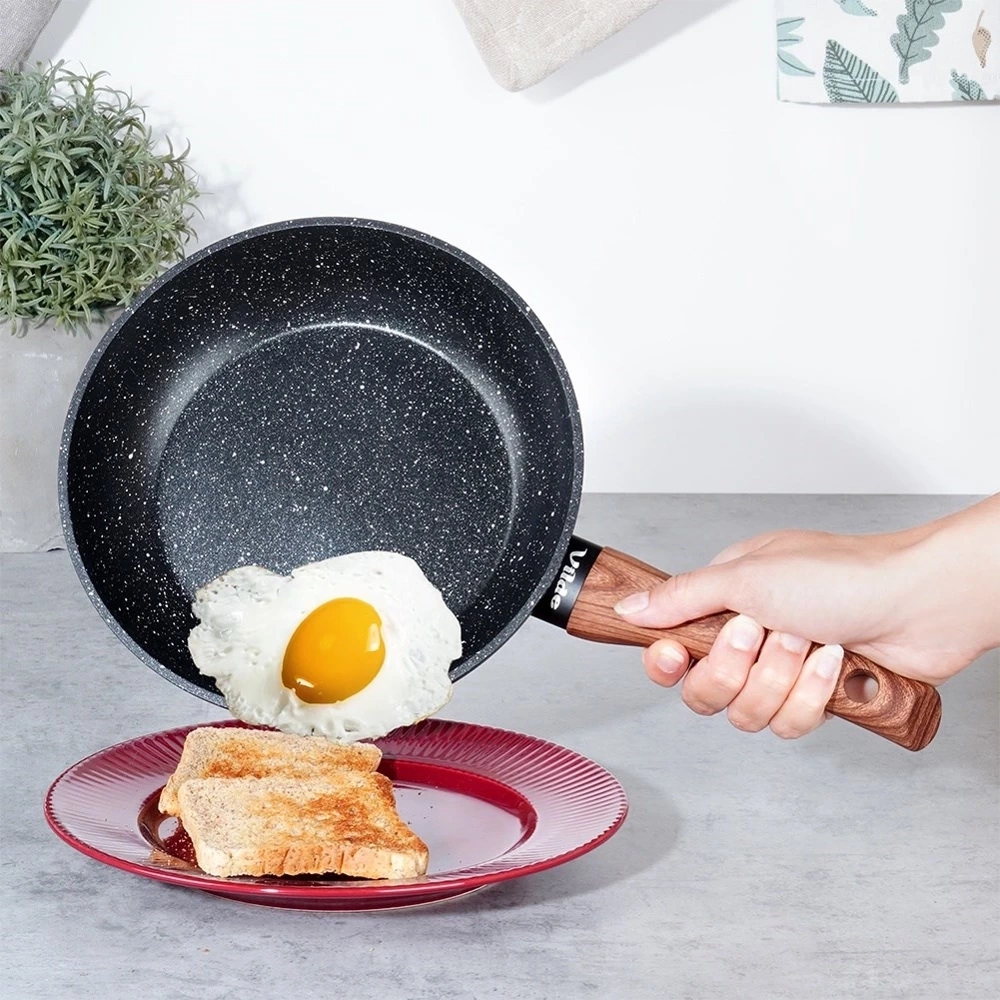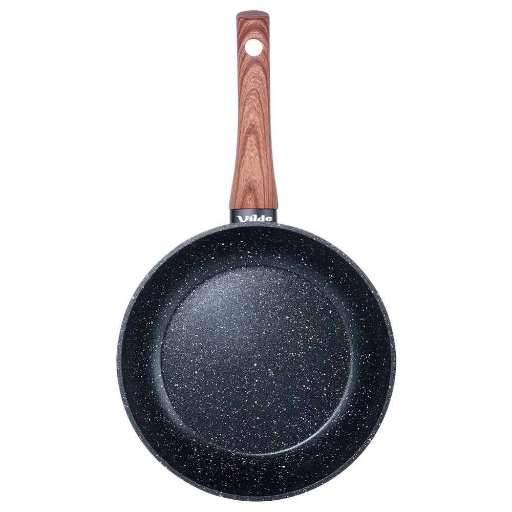 Nieprzywierająca patelnia o wyjątkowym, ponadczasowym wyglądzie. Patelnia utrzymana w modnym połączeniu czerni z drewnem, dzięki czemu efektownie prezentuje się w kuchni. Niezastąpiona w każdej kuchni, ułatwia gotowanie, smażenie i duszenie potraw. Wykonana z najwyższej jakości materiałów, odpowiednio użytkowana posłuży długie lata. Oryginalny produkt marki Vilde z linii Black&Wood. Wyprodukowano zgodnie z europejskimi standardami.