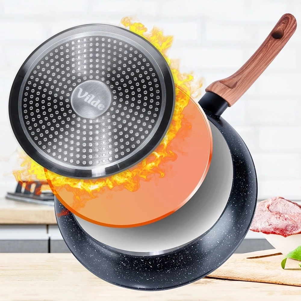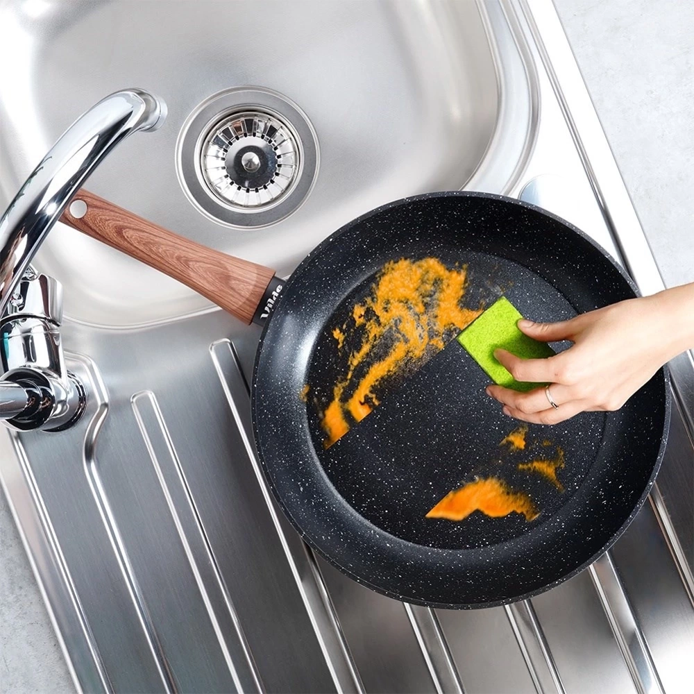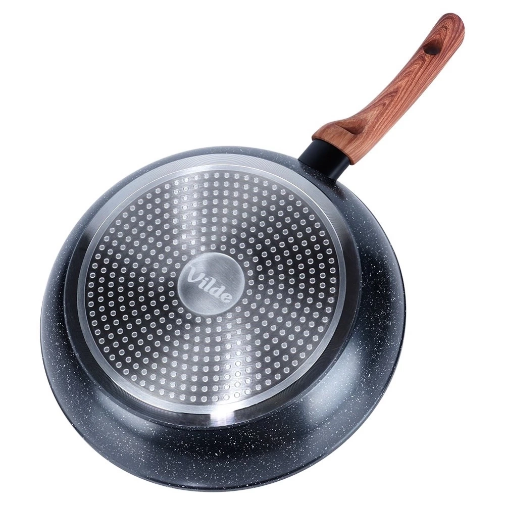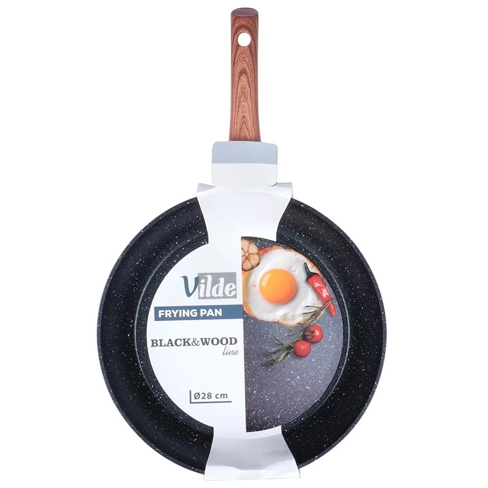 Nieprzywierająca patelnia o wyjątkowym, ponadczasowym wyglądzie. Patelnia utrzymana w modnym połączeniu czerni z drewnem, dzięki czemu efektownie prezentuje się w kuchni. Niezastąpiona w każdej kuchni, ułatwia gotowanie, smażenie i duszenie potraw. Wykonana z najwyższej jakości materiałów, odpowiednio użytkowana posłuży długie lata. Oryginalny produkt marki Vilde z linii Black&Wood. Wyprodukowano zgodnie z europejskimi standardami.