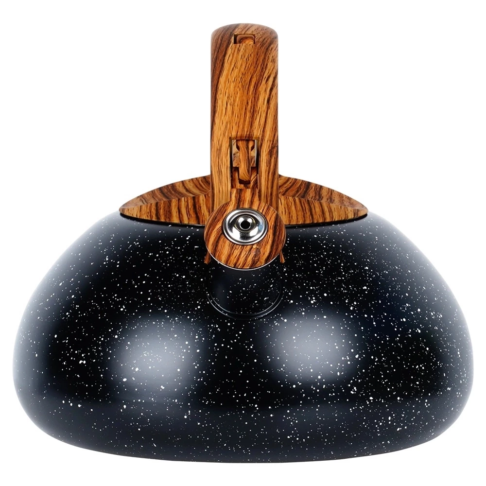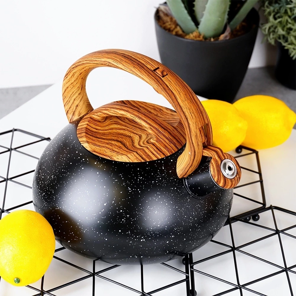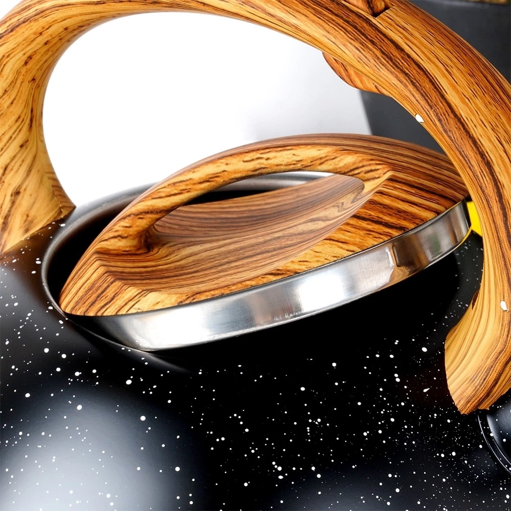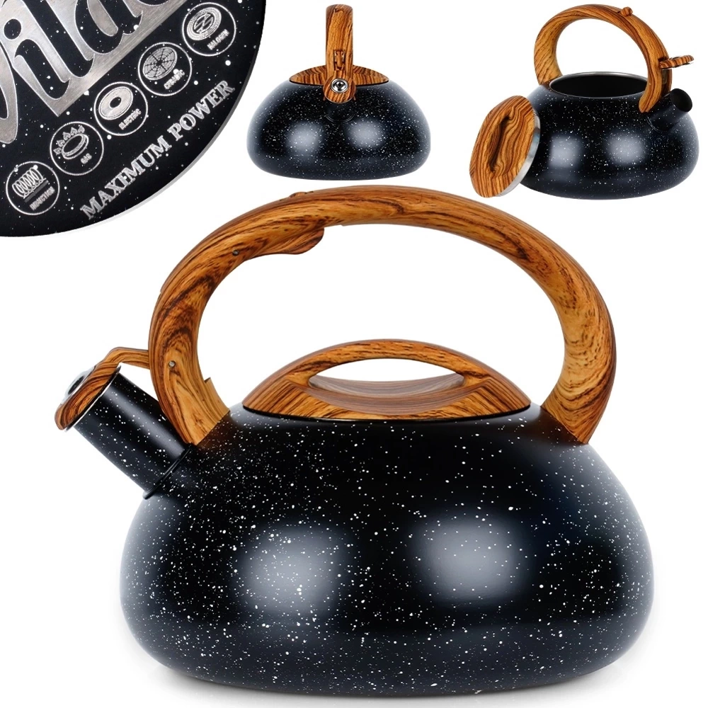 - Czajnik z automatycznym gwizdkiem. Wykonany ze stali nierdzewnej w czarnym kolorze z elementami imitującymi drewno. Do stosowania na wszystkich rodzajach kuchenek.