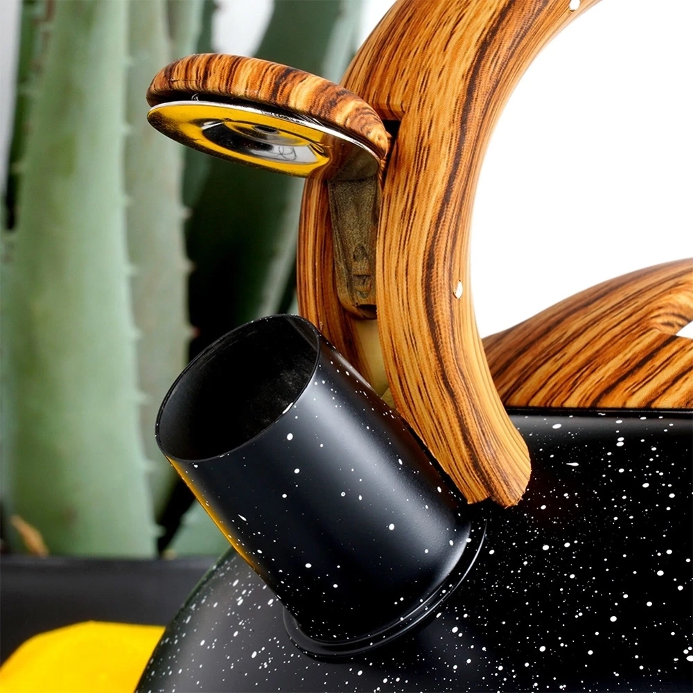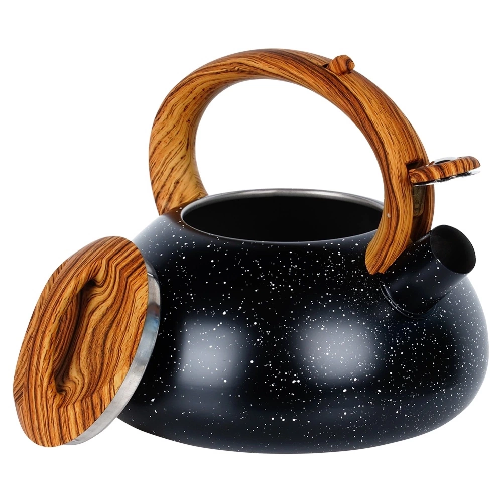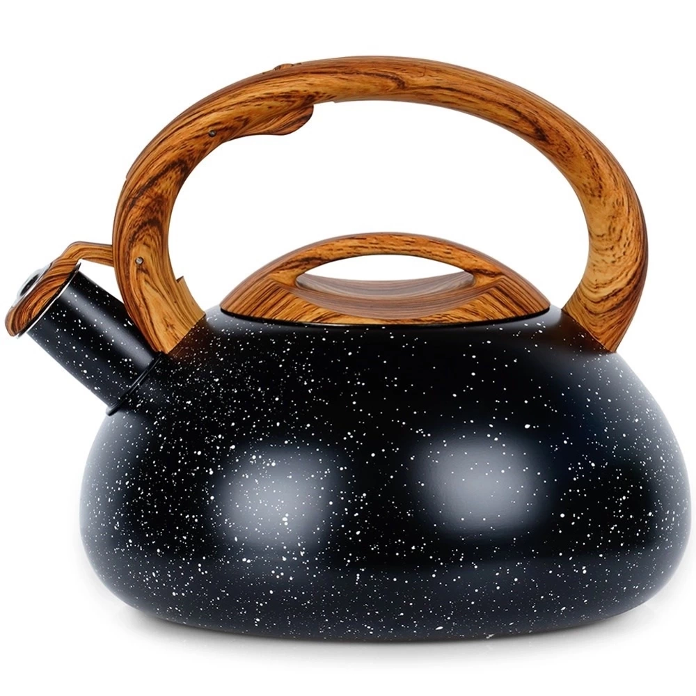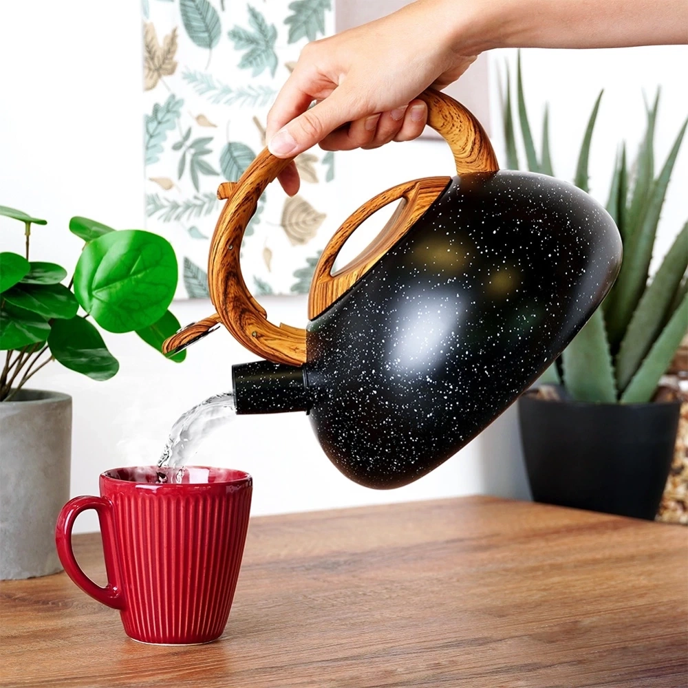 - Czajnik z automatycznym gwizdkiem. Wykonany ze stali nierdzewnej w czarnym kolorze z elementami imitującymi drewno. Do stosowania na wszystkich rodzajach kuchenek.