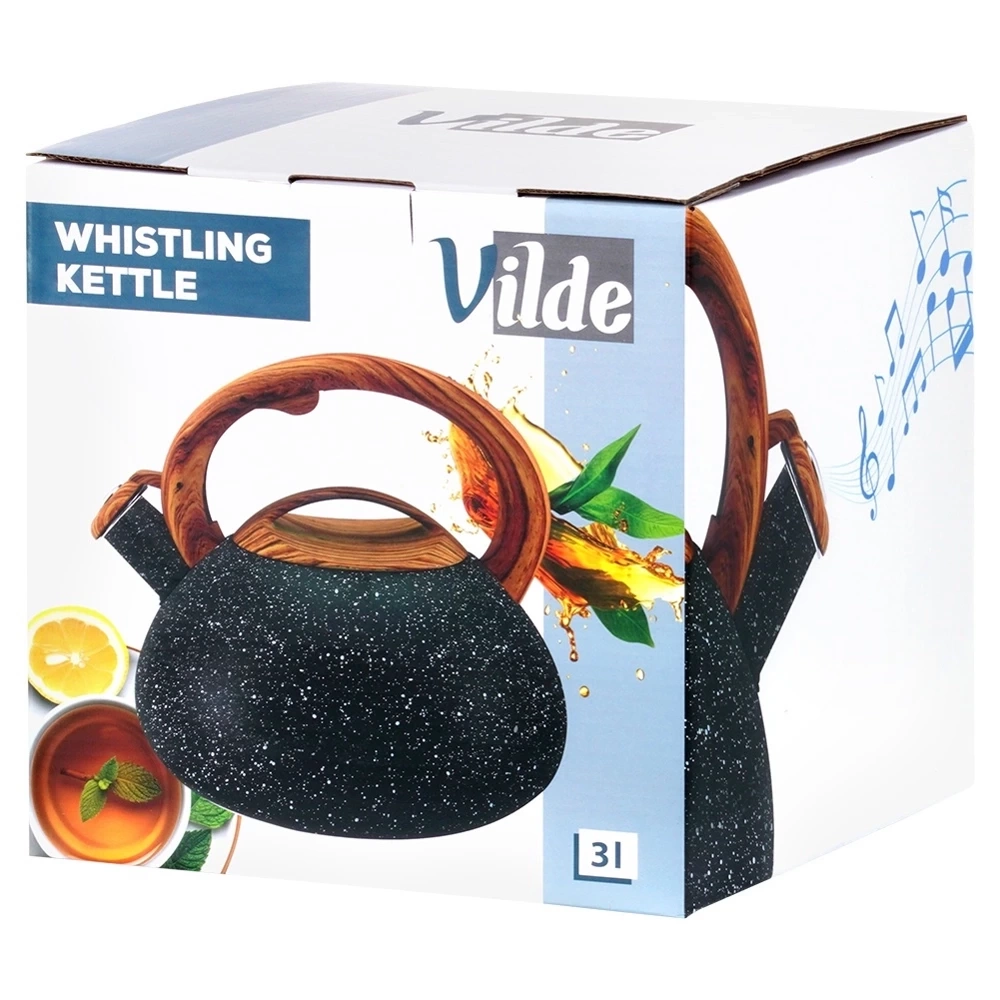 Efektowny czajnik wykonany z najwyższej jakości materiałów. Wykorzystamy go do zagotowania wody na kawę, herbatę czy do zaparzenia ziół. Wygodny w użytkowaniu, dzięki rączce, pokrywce oraz automatycznemu gwizdkowi. Wodę w czajniku zagotujemy bardzo szybko, a czyszczenie go jest bardzo wygodne. Czajnik jest świetnym pomysłem na prezent. UWAGA! Czajnik do gotowania musi być napełniony co najmniej do połowy aby zapobiec przegrzaniu. Zmiany koloru na powierzchni zewnętrznej w przypadku nieprzestrzegania minimalnych parametrów użytkowych nie mogą być powodem do reklamacji. Oryginalny produkt marki Vilde. Wyprodukowano zgodnie z europejskimi standardami.