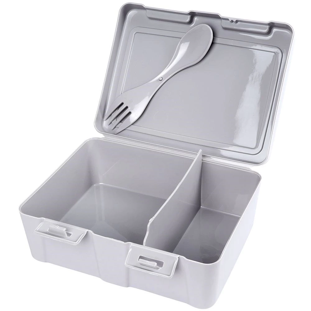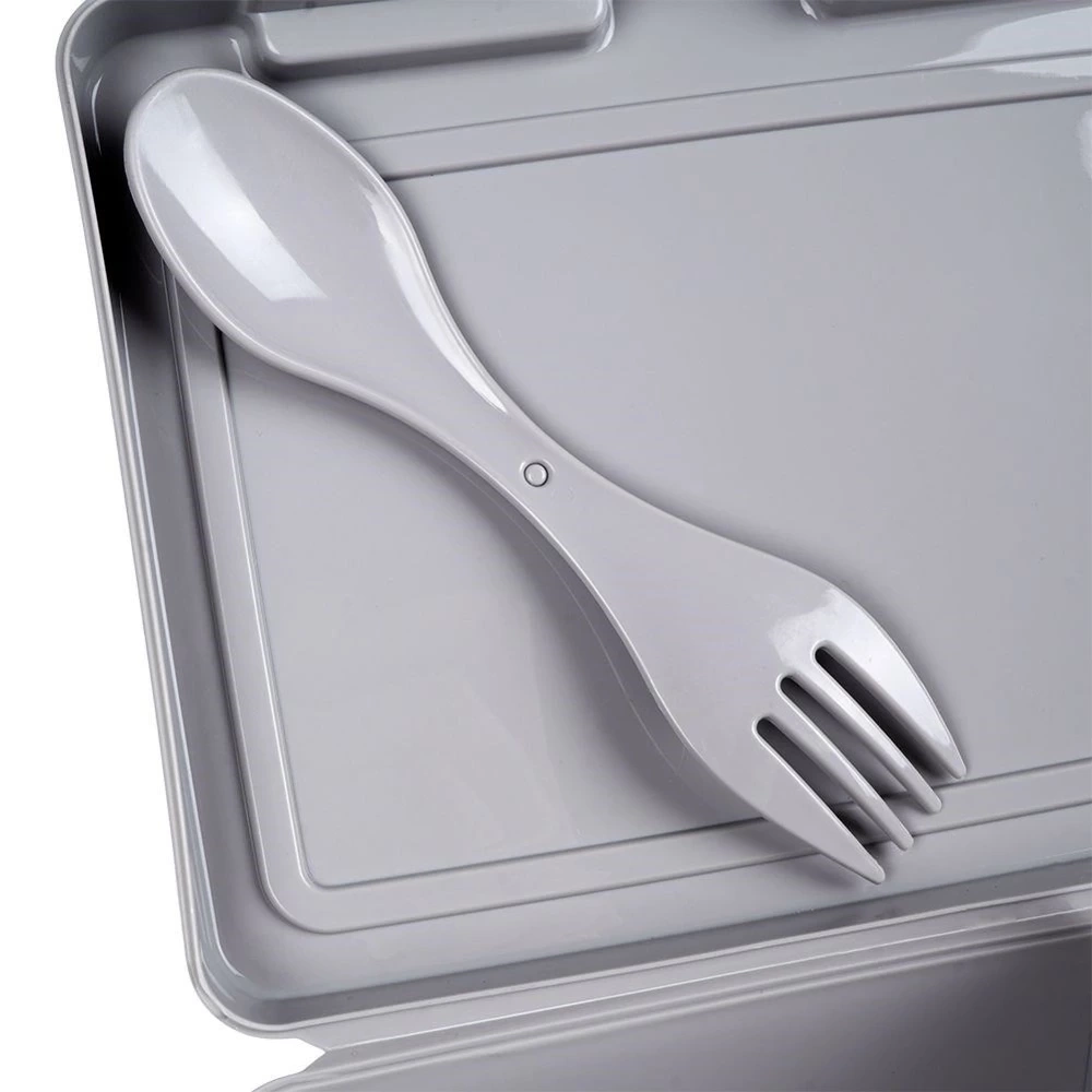 Pojemnik śniadaniowy z dwoma przegródkami. Wyposażony sztućce w formie turystycznej łyżki z jednej strony a widelca z drugiej. Sztućce możemy umieścić w specjalnym miejscu pod pokrywką, dzięki czemu możemy ich zawsze użyć. Pojemnik jest lekki, wykonany z materiałów bezpiecznych dla zdrowia i neutralnych dla żywności. Zamykany na dwa wygodne klipsy. Pojemnik świetnie sprawdzi się na śniadania, przekąski, obiady, sałatki. W celu zachowania ładnego wyglądu nie zaleca się mycia w zmywarce do naczyń oraz podgrzewania w mikrofalówce. Oryginalny produkt czeskiej marki Orion. Wyprodukowano zgodnie z europejskimi standardami.