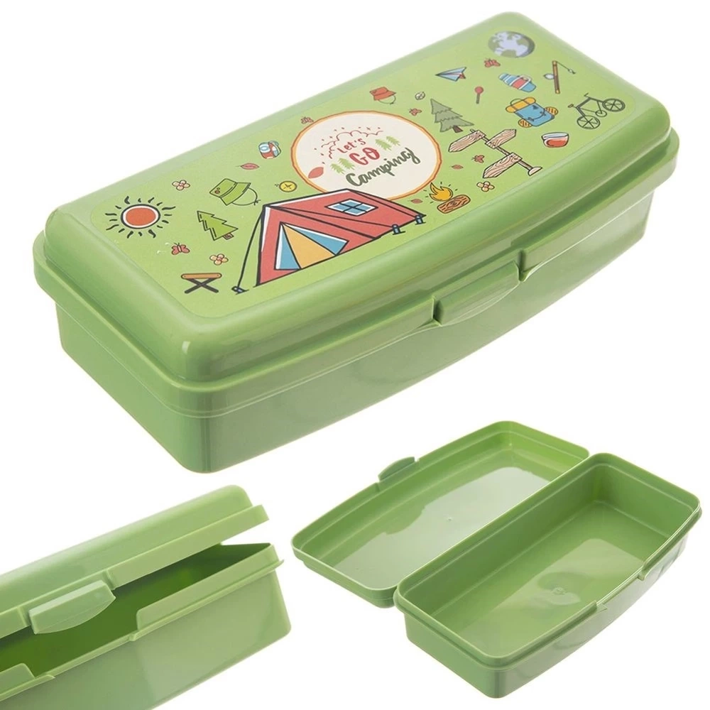 - Pojemnik śniadaniowy zamykany na klips. Wykonany z wysokiej jakości tworzywa w kolorze zielonym z motywem kempingu. Posiada jedną przegródkę.