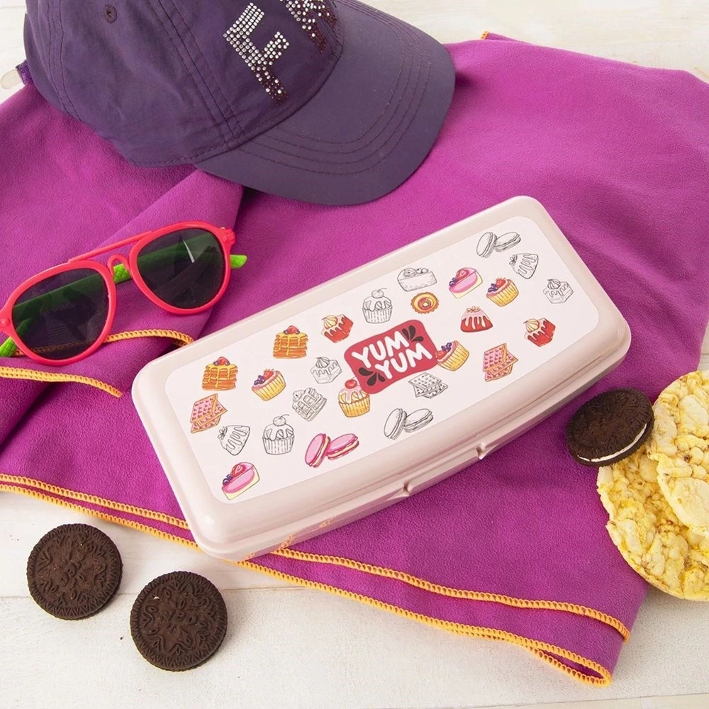 - Pojemnik śniadaniowy zamykany na klips. Wykonany z wysokiej jakości tworzywa w kolorze różowym z motywem ciasteczek. Posiada jedną przegródkę.