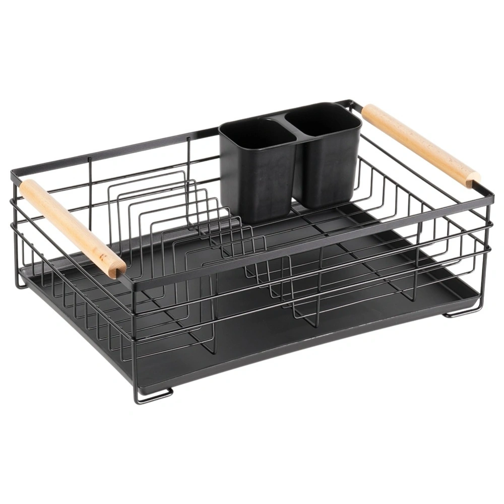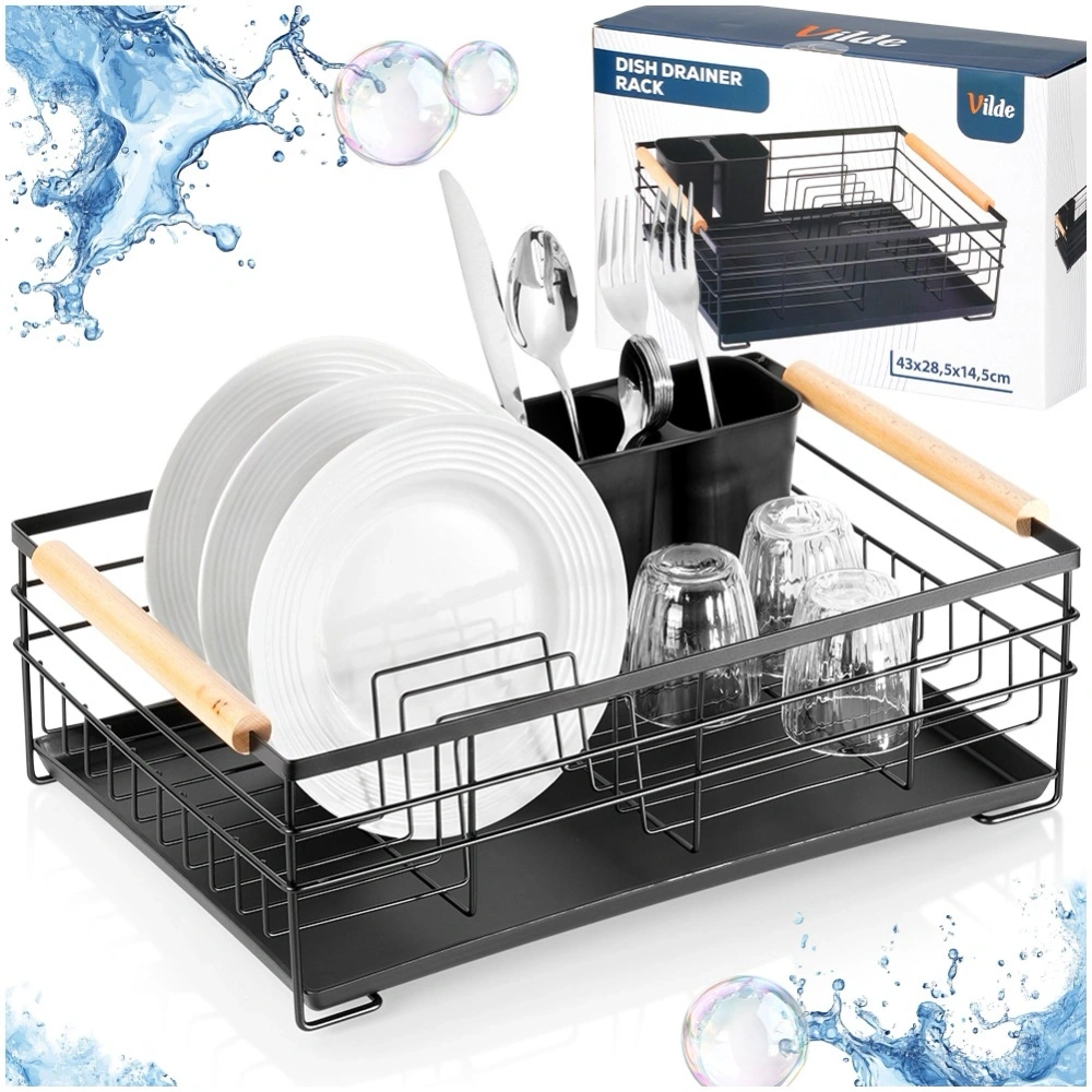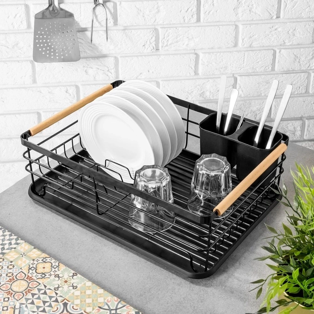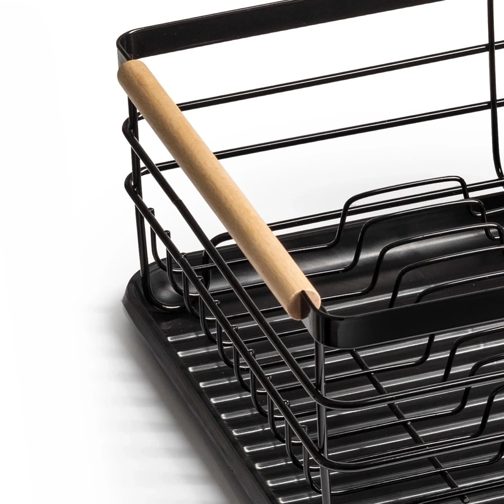 - Elegancka suszarka do naczyń w kolorze czarnym z bambusowymi uchwytami. Posiada miejsce na talerze, szklanki oraz ociekacz sztućce. Wyposażona w tacę ociekową.
