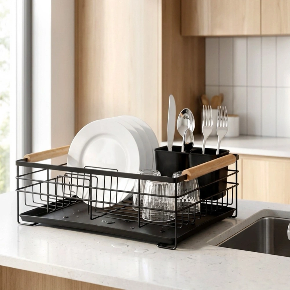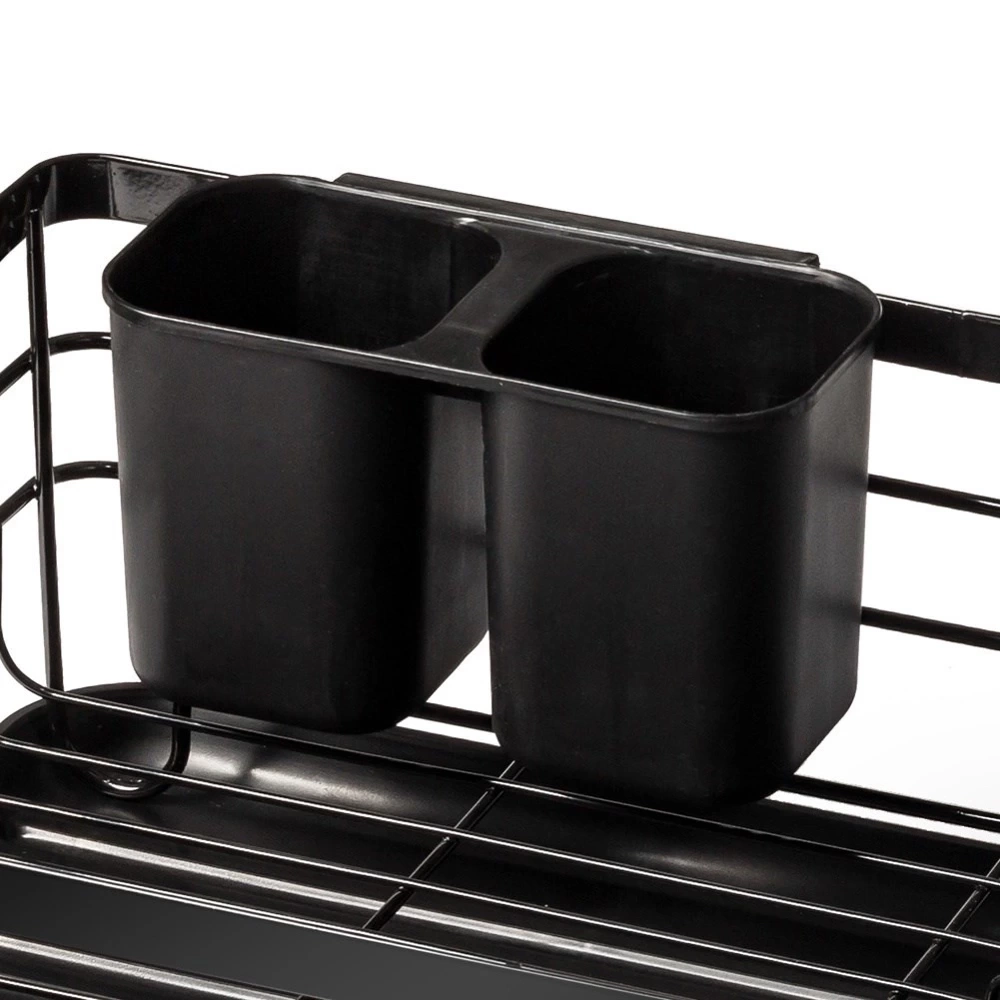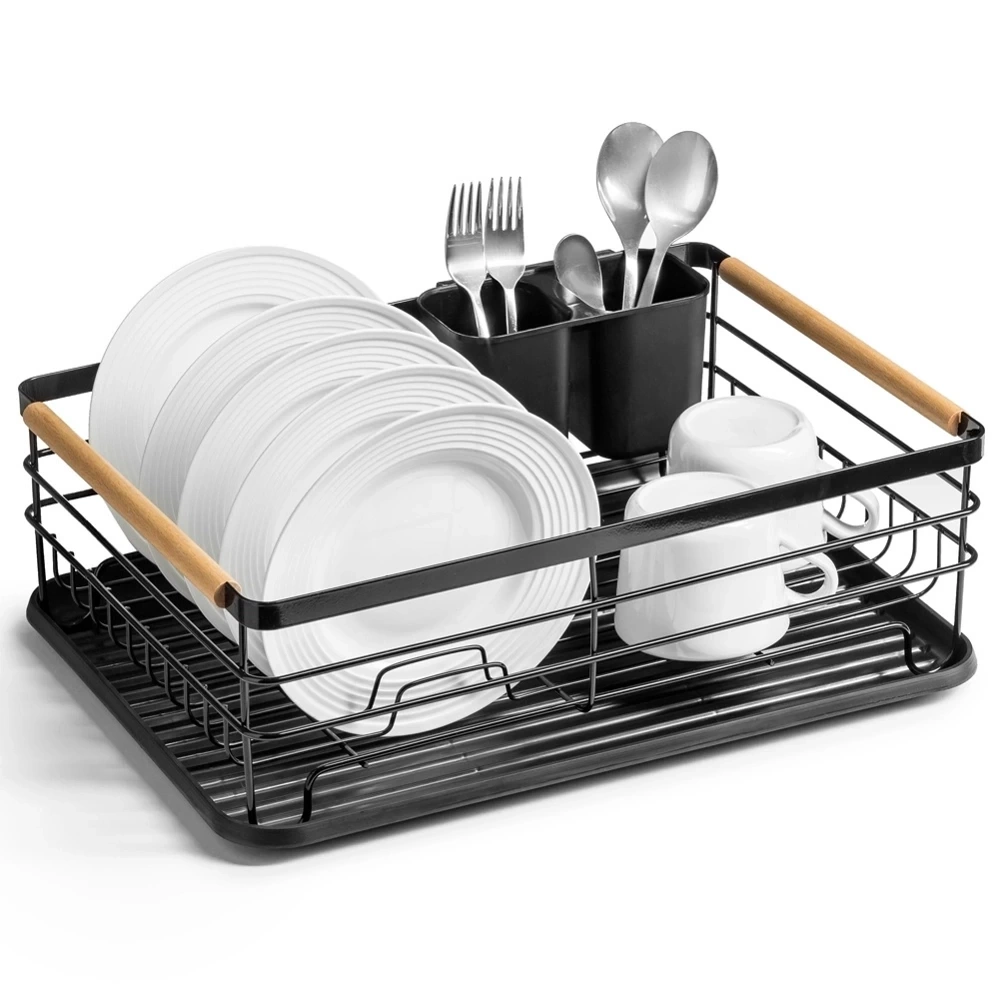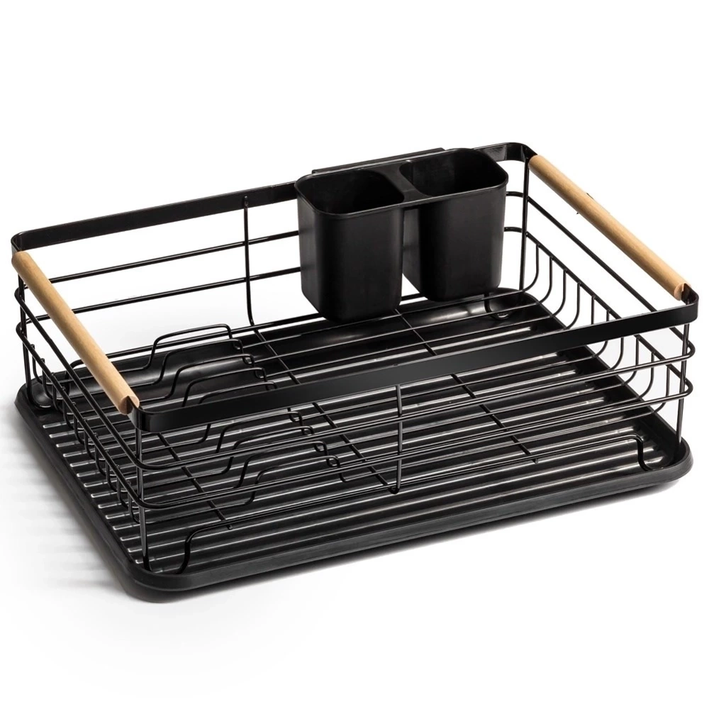 - Elegancka suszarka do naczyń w kolorze czarnym z bambusowymi uchwytami. Posiada miejsce na talerze, szklanki oraz ociekacz sztućce. Wyposażona w tacę ociekową.