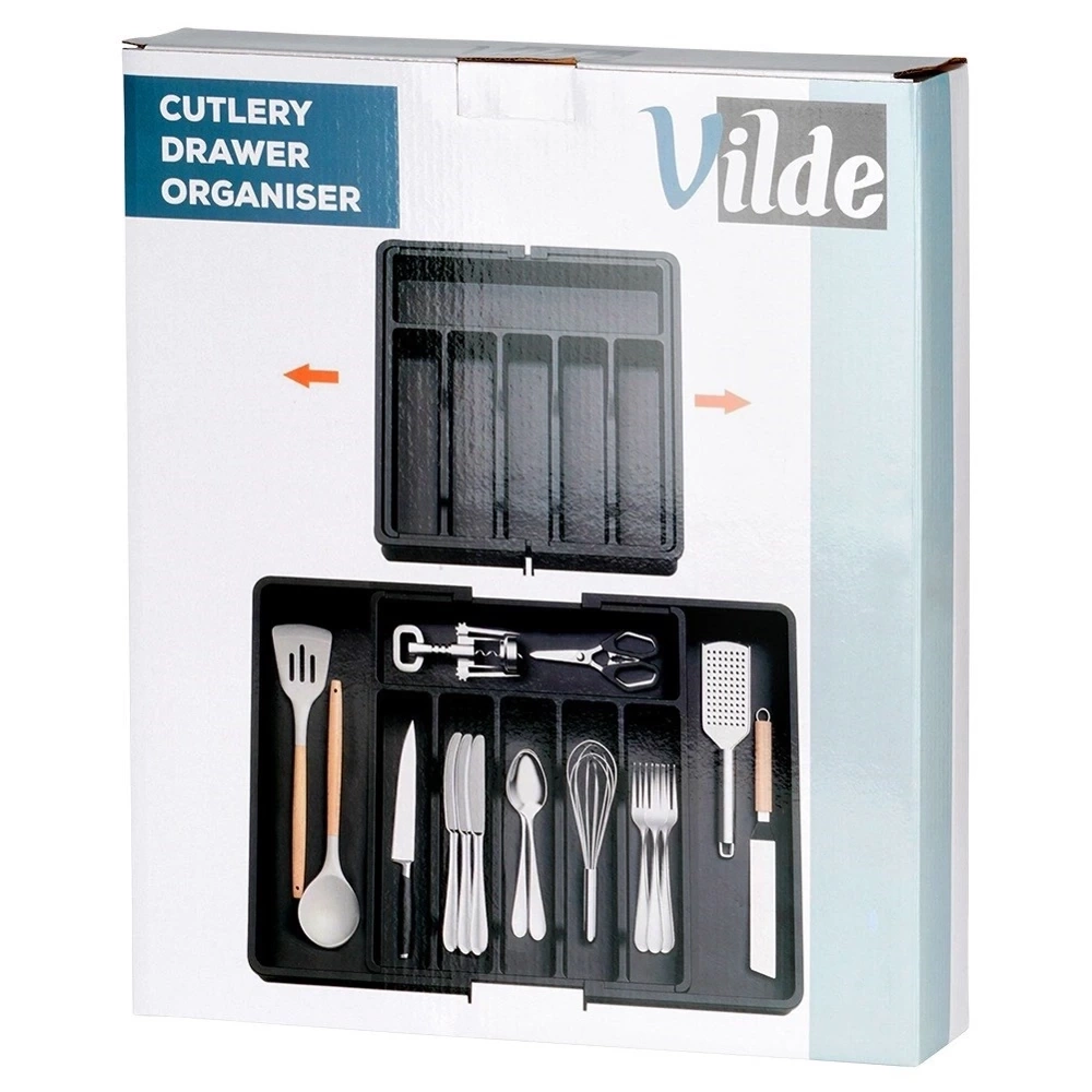 Organizer na sztućce, noże i przybory kuchenne z możliwością rozsuwania. Przydatny w każdej kuchni. Umożliwia przechowywanie różnych akcesoriów kuchennych w sposób uporządkowany i zorganizowany. Taca do szuflady pozwoli odpowiednio zagospodarować przestrzeń oraz utrzymać porządek wewnątrz szuflady. Łatwy w czyszczeniu i wygodny w użytkowaniu. Oryginalny produkt marki Vilde. Wyprodukowano zgodnie z europejskimi standardami.