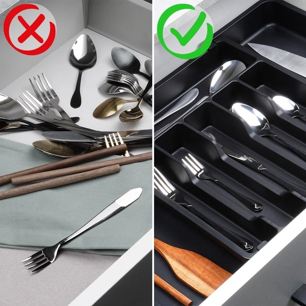 - Wkład na sztućce i przybory kuchenne do szuflady - Rozsuwany organizer na sztućce i przybory kuchenne umożliwiający wygodne posegregowanie noży oraz sztućców. Wkład po rozłożeniu ma wymiary 56,5 x 37,5 x 5 cm. Doskonały na sztućce, noże oraz akcesoria kuchenne.
