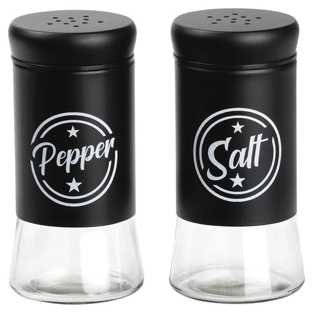 - Zestaw składa się z dwóch pojemników solniczki i pieprzniczki. Niezbędny zestaw w każdej kuchni. Wykonany z przezroczystego szkła z czarnymi elementami.