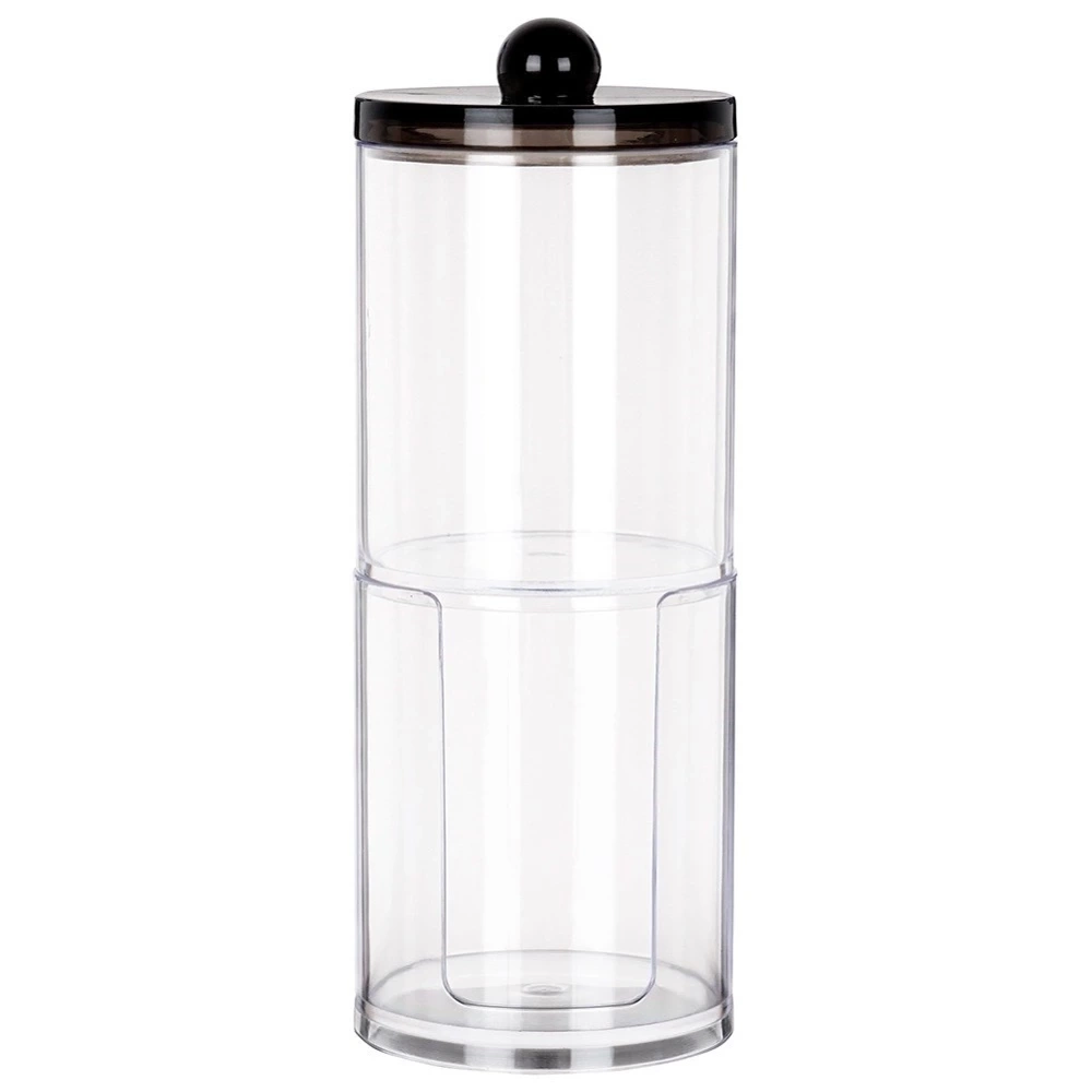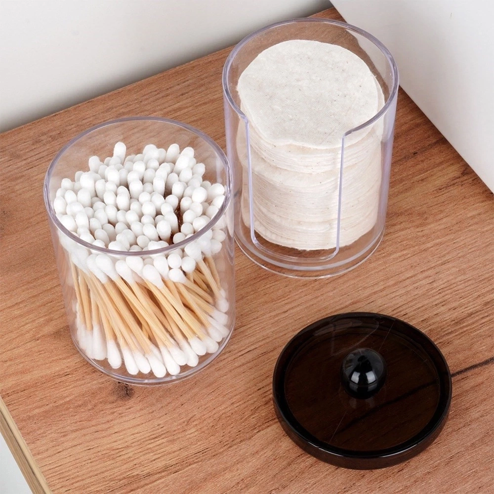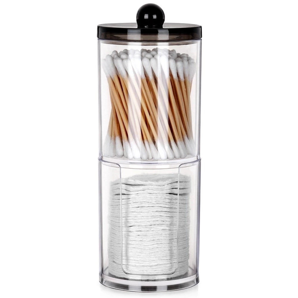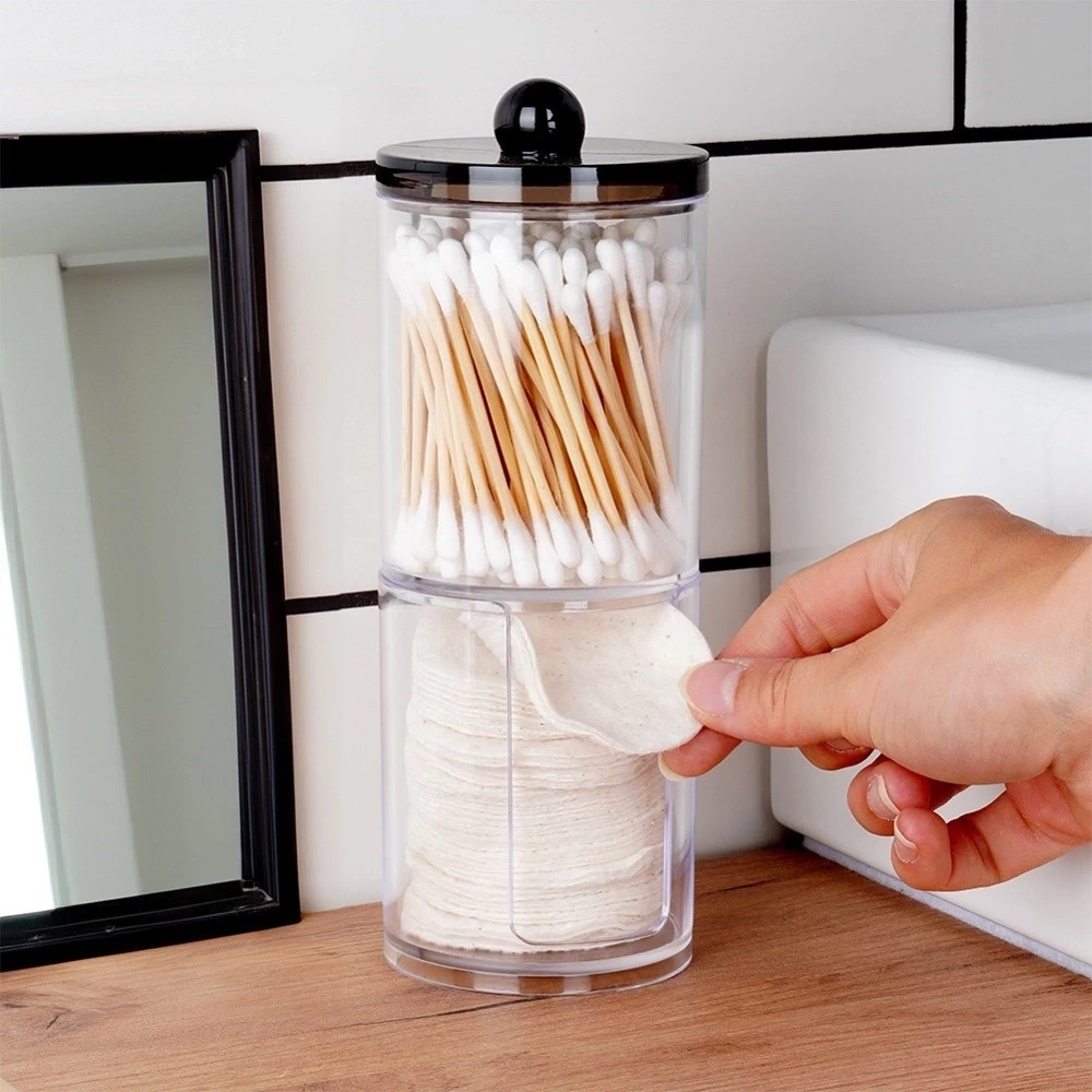 - Dwupoziomowy pojemnik na patyczki i płatki kosmetyczne 2w1 - Praktyczny zestaw składający się z dwóch pojemników do przechowywania patyczków oraz płatków kosmetycznych. Pojemniki są skonstruowane w taki sposób, aby można było wygodnie ustawić jeden na drugim, co pozwala na oszczędność miejsca w łazience. Pojemniki wykonane z przezroczystego akrylu. Pojemnik ma wymiary 7 x 18,5 cm.