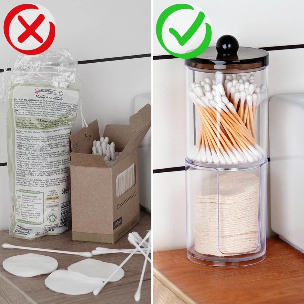 - Praktyczny i wygodny - Pojemniki są kompaktowe, zajmują niewiele miejsca, ale jednocześnie pomieszczą wystarczającą ilość patyczków do uszu oraz płatków kosmetycznych, co czyni je niezwykle praktycznym rozwiązaniem do codziennego użytku.