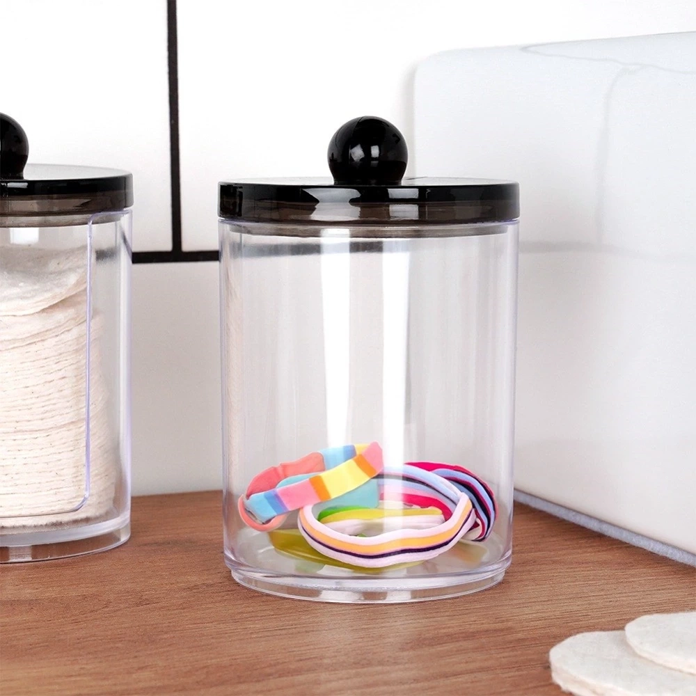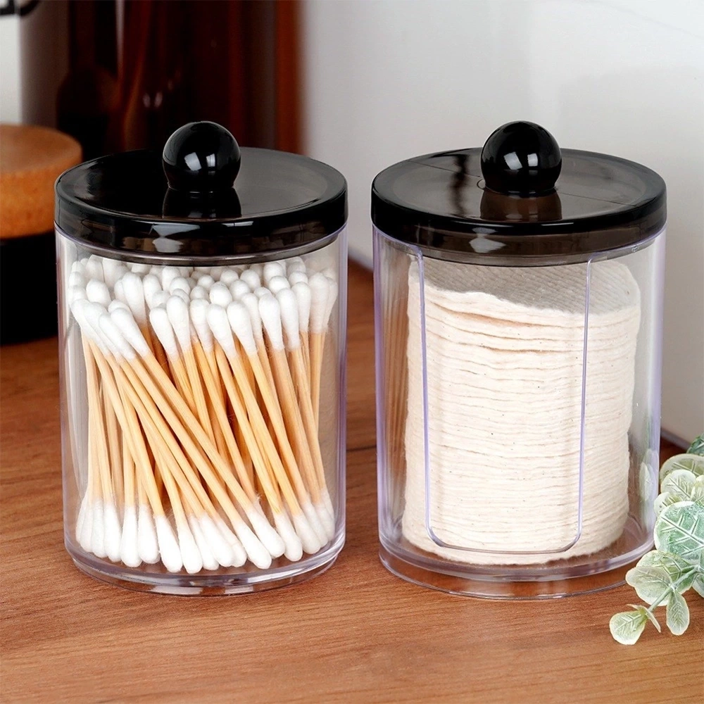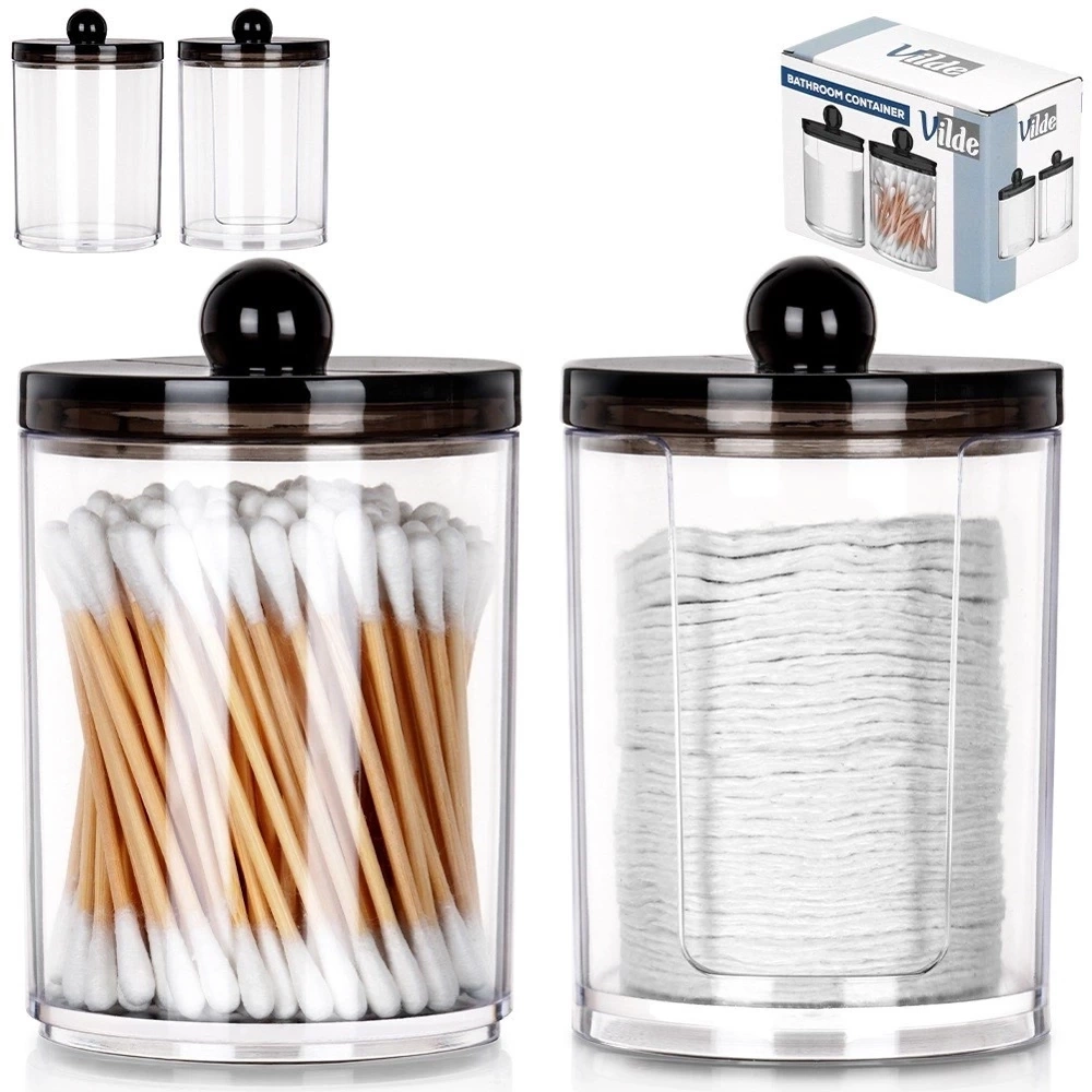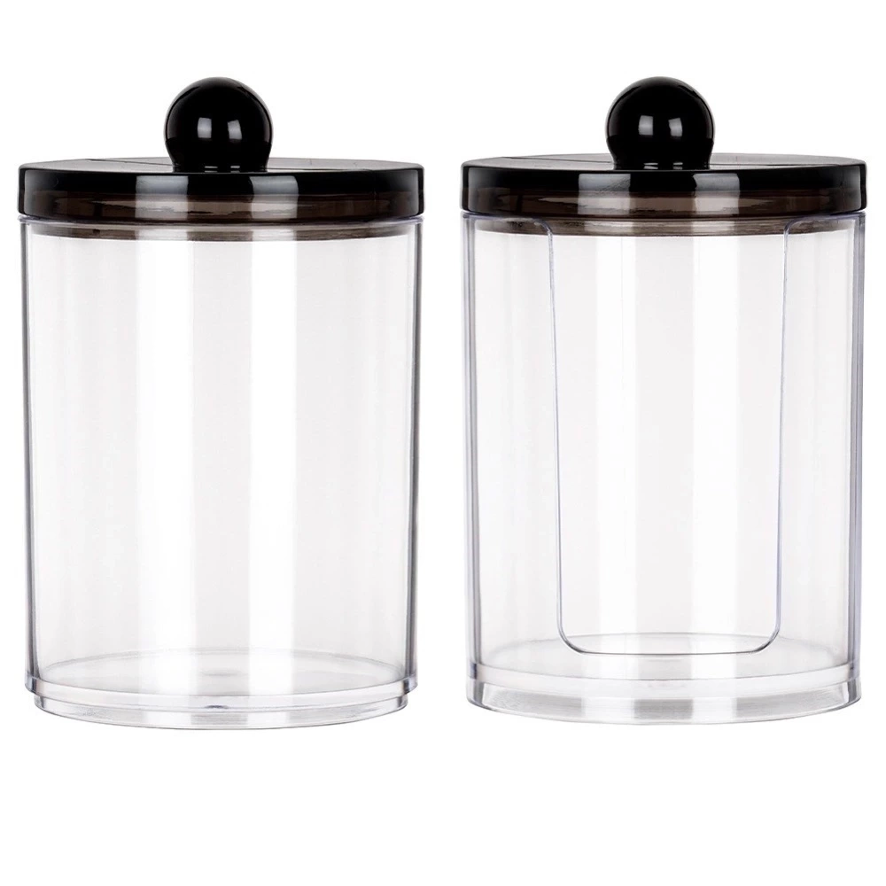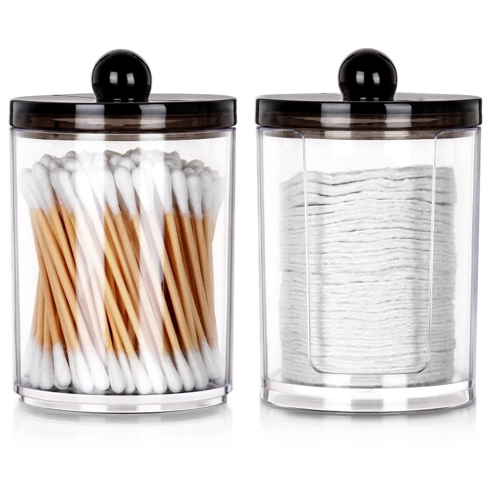 - Zestaw 2 pojemników na płatki i patyczki kosmetyczne z czarnymi pokrywkami to praktyczne rozwiązanie do każdej łazienki. Pomogą w uporządkowaniu przestrzeni.