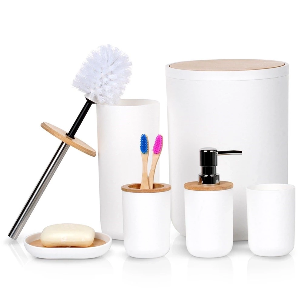 - Przydatny zestaw akcesoriów łazienkowych w białym kolorze z elementami bambusowymi. Składający się z: dozownika na mydło, mydelniczki, 2x kubka, szczotki do WC oraz kosza na śmieci.